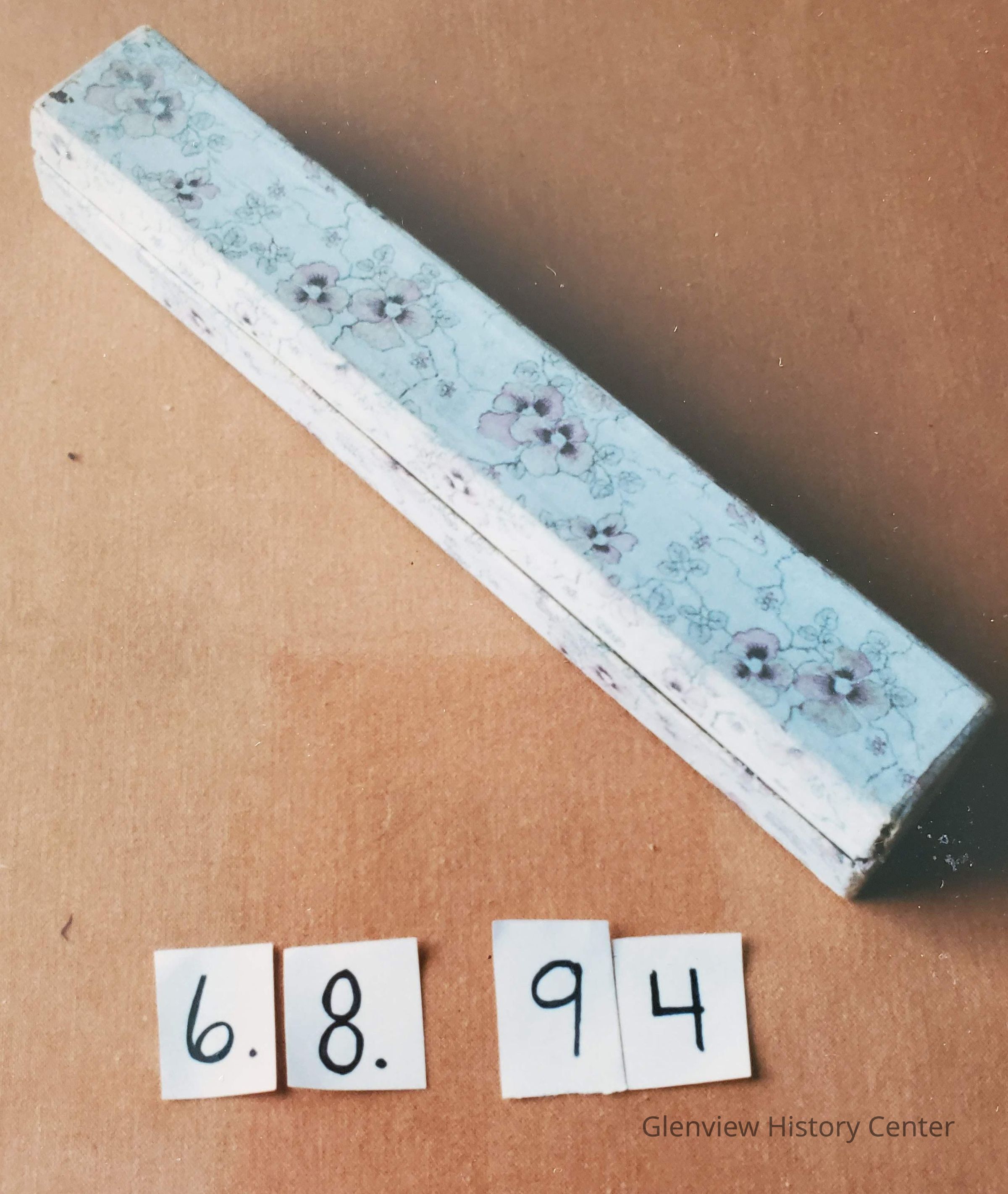 Small decorative box, pink pansy design for fan storage.