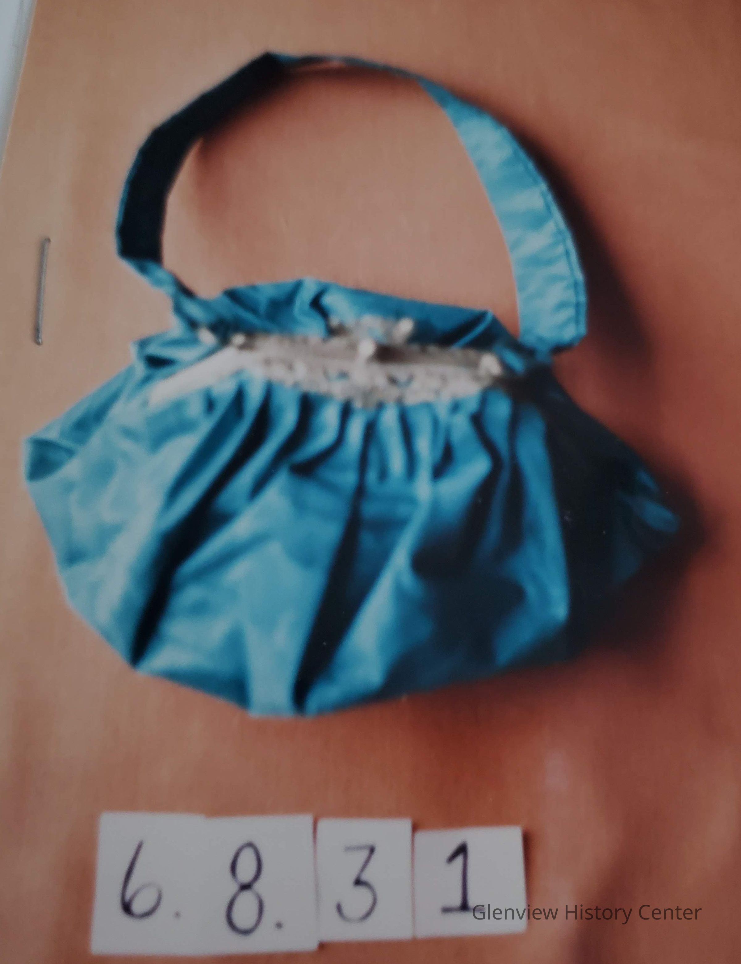 One green Moire Taffeta evening bag 6" deep and 6-1/2" wide with a 14" ribbon handle and a metal clasp -- a small round oxidized mirror inside, purple lining.Acquisition