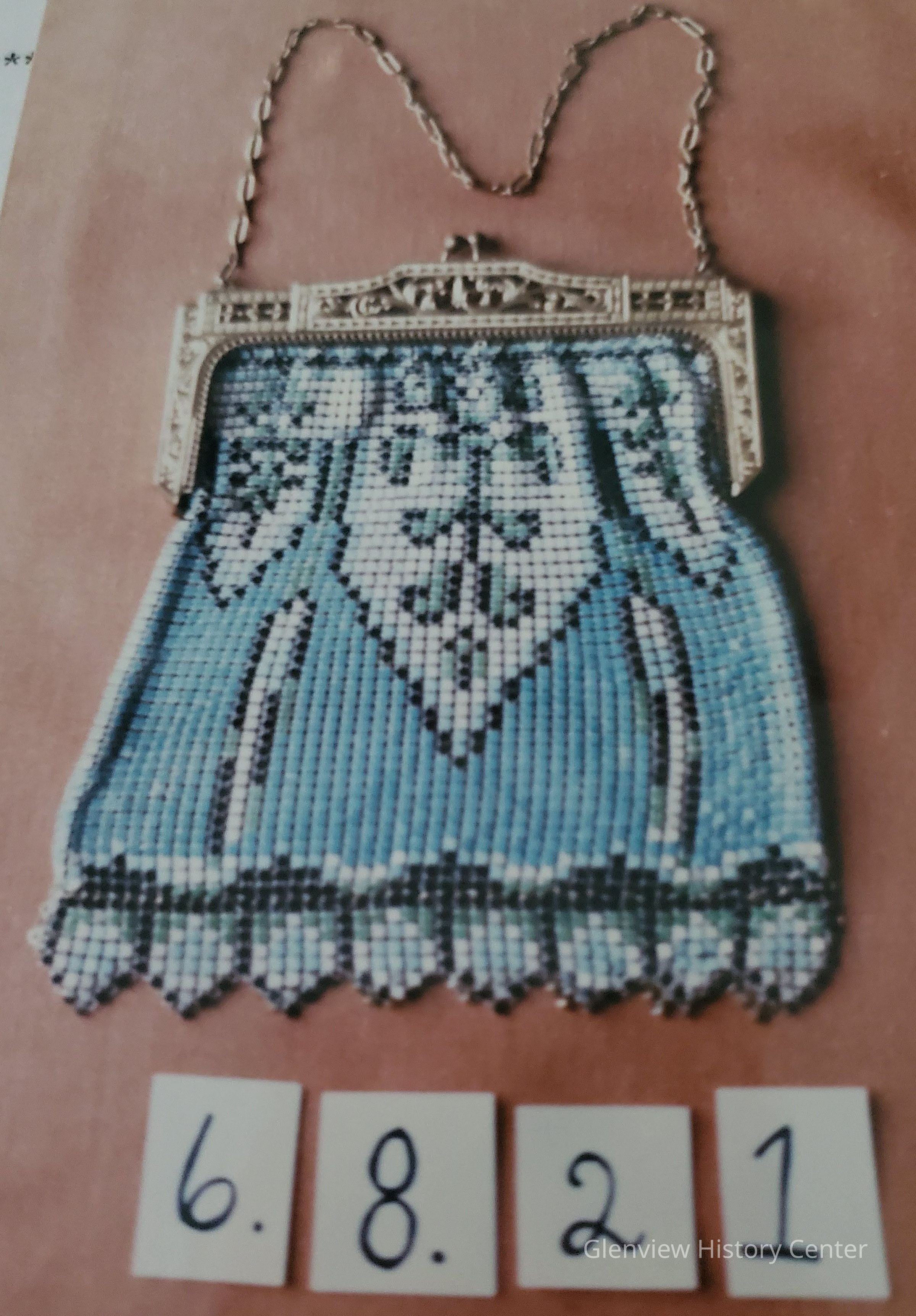 Metal top of gold filigree, star shaped painted mesh, multi-colored: powder blue, green, white and black; bottom is pico/sawtoothed edge.Acquisition