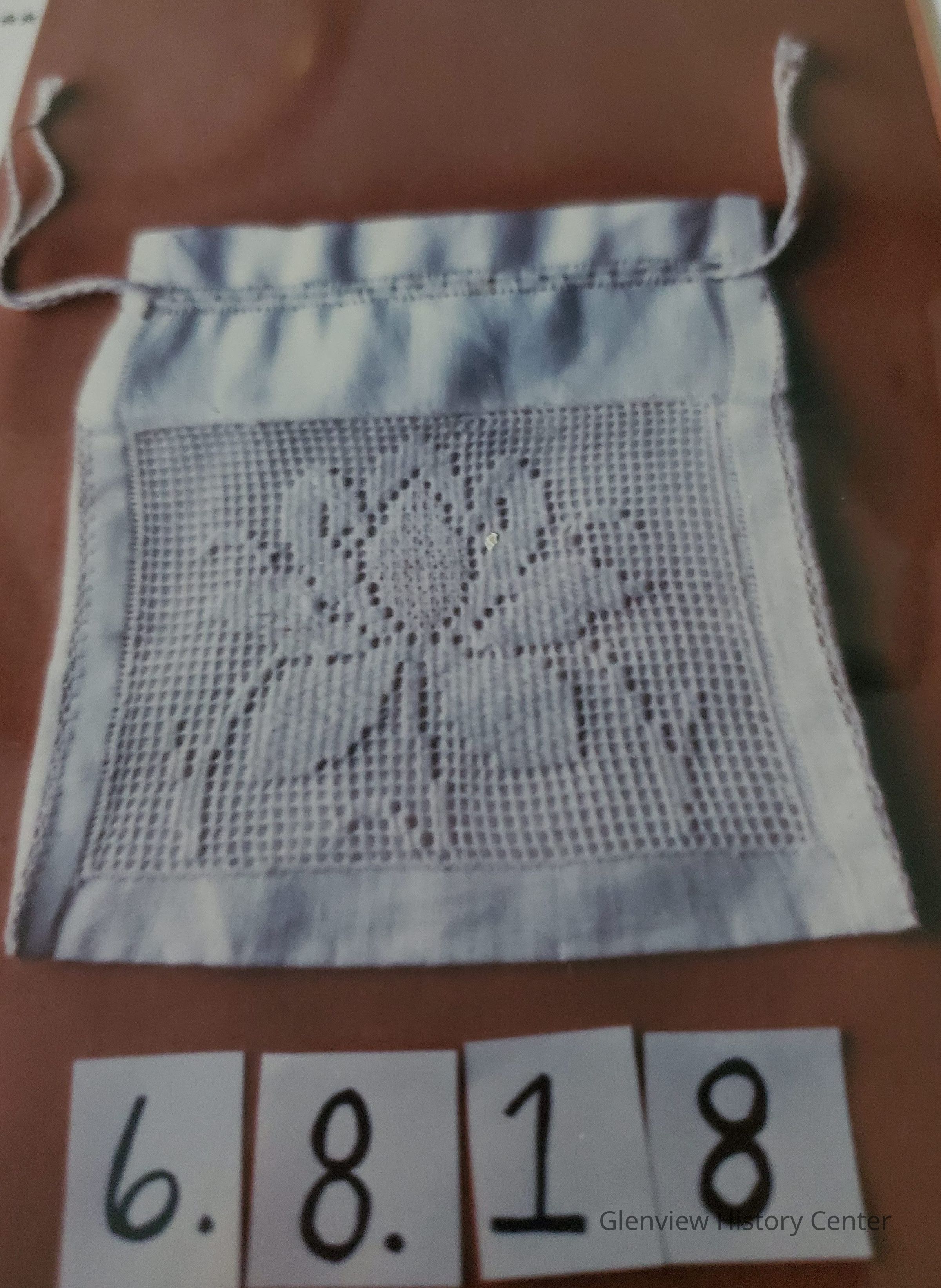 Small white linen drawstring bag -- open iris design on front. Sides feather stitched together.