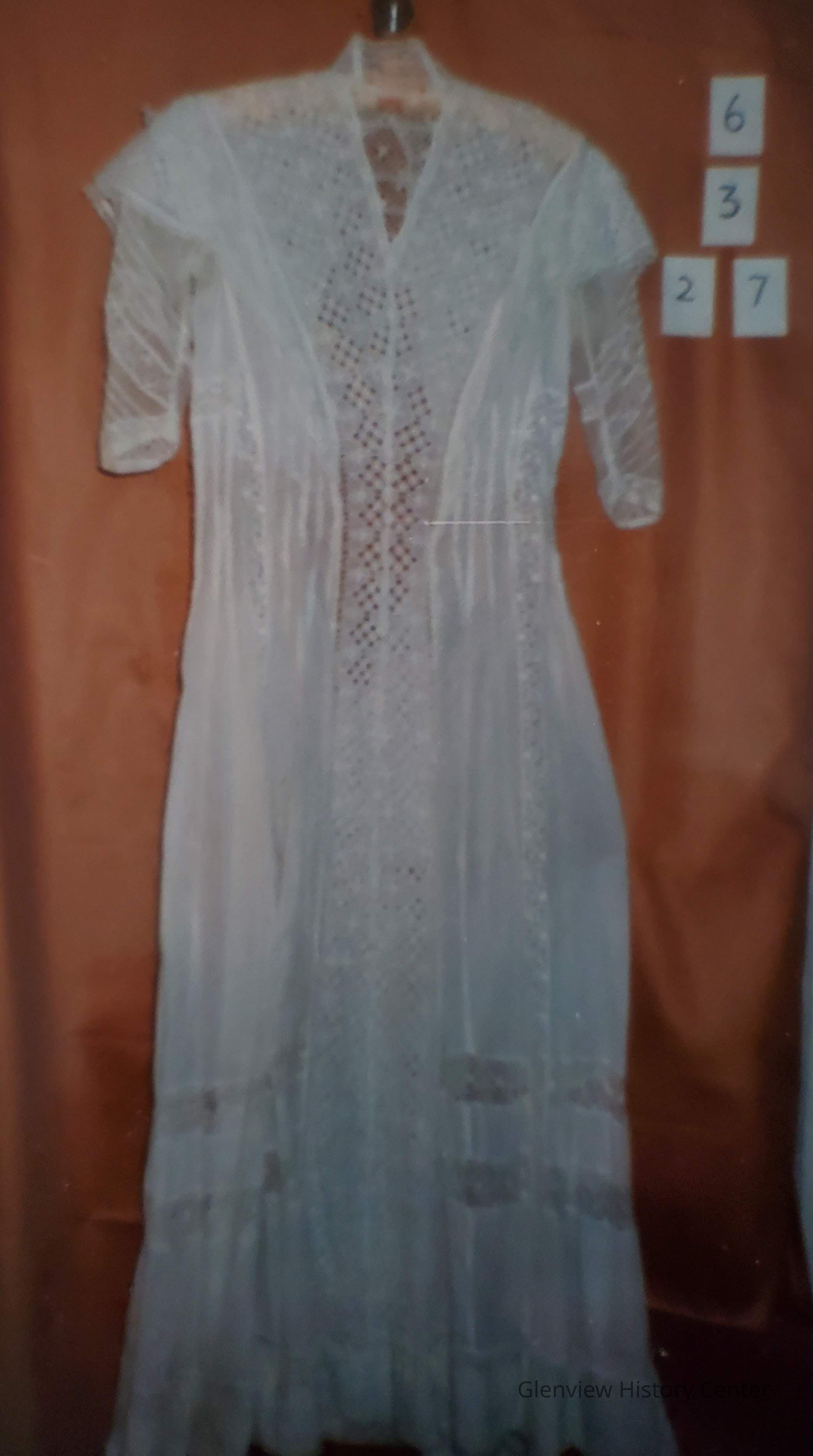Summer sheer, lady's dress, hook and eye closing down back; standup jewel neckline with 3" boning - cap sleeve lace 3/4" fine net crochet - machine stitched - satin stitch flower open crochet V neck insert, front bodice; shoulder extension lace overlay on sleeve cap - 2 open eyelet lace front panels; inverted pleats, five to a panel in front; 19" above hemline 2" crochet insert circles skirt, another insert is 2" lower - 4" insert of the front panels circles dress, 31 hook and eyes.