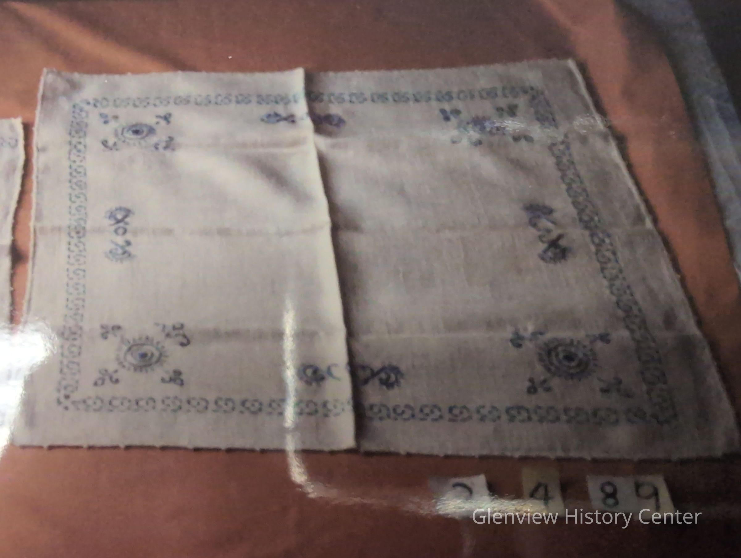 square textured linen (20") hand embroidered with blue thread matches smaller (16 1/2 x 10 1/4)