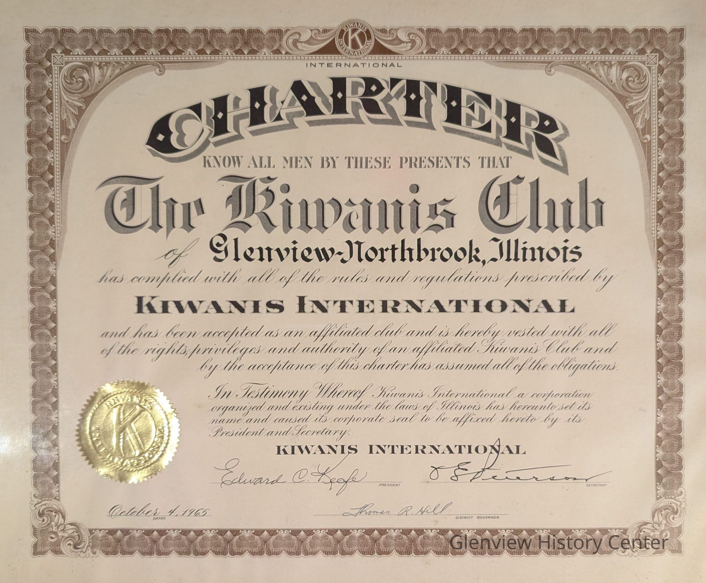 Framed charter for the Kiwanis Club of Glenview - Northbrook from October 4, 1965Relationships