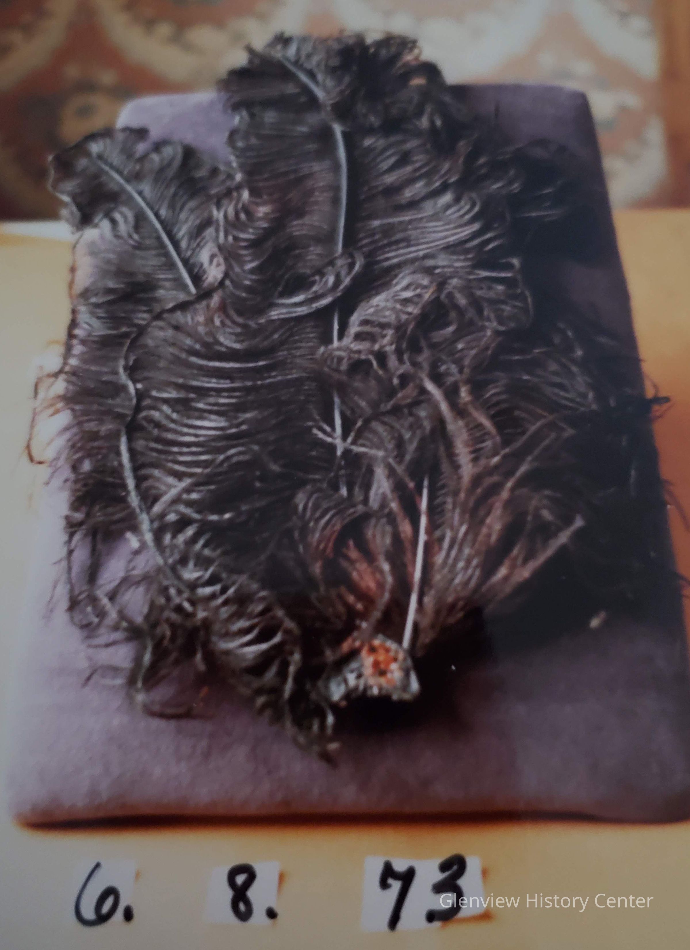 Three black ostrich plumes attached to gesso-like base. Could be stick fan (entire stick missing) or hat trim.