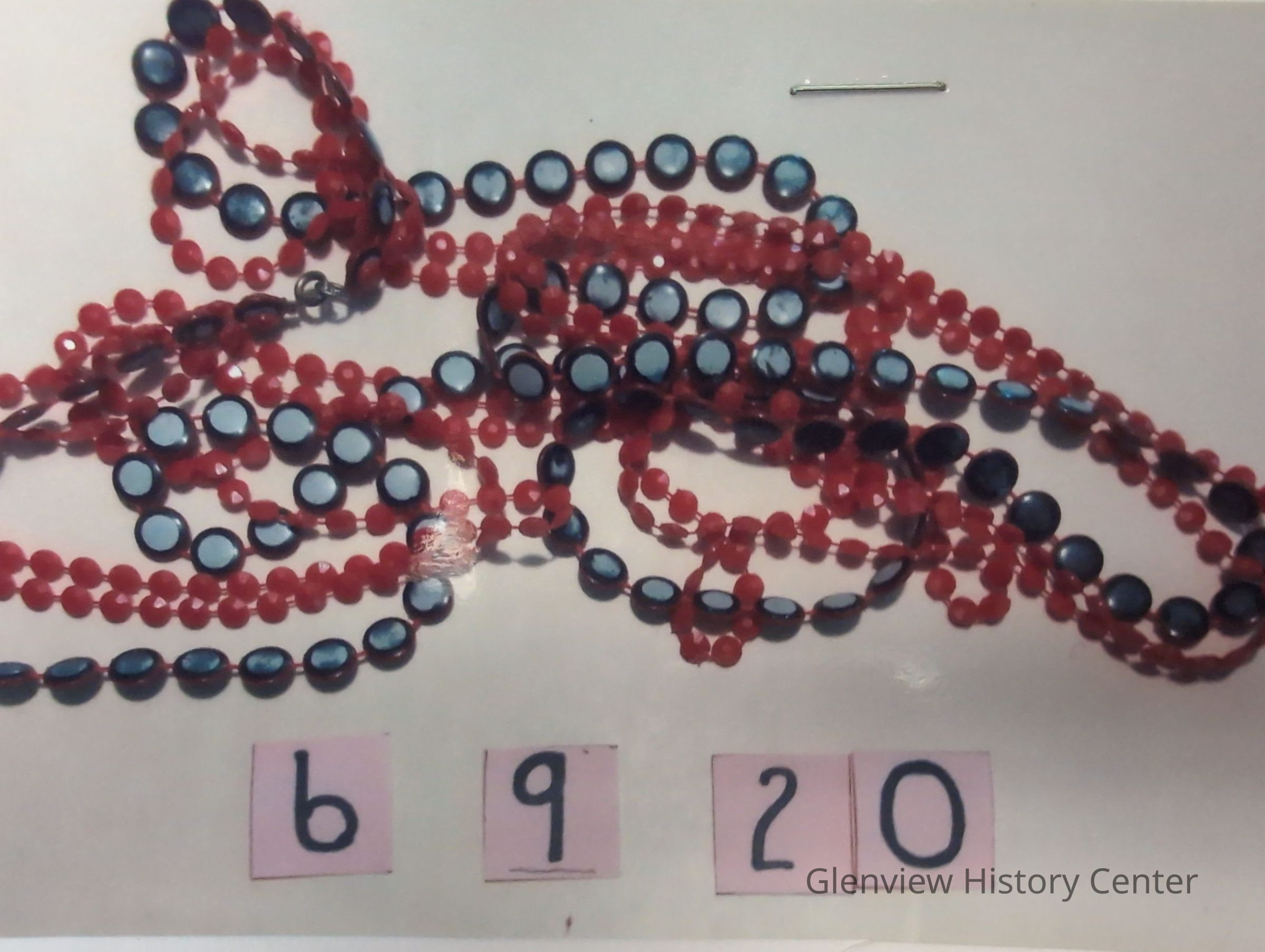 Three stand necklace: two long strands of red plastic beads and one strand of black and pearl beads