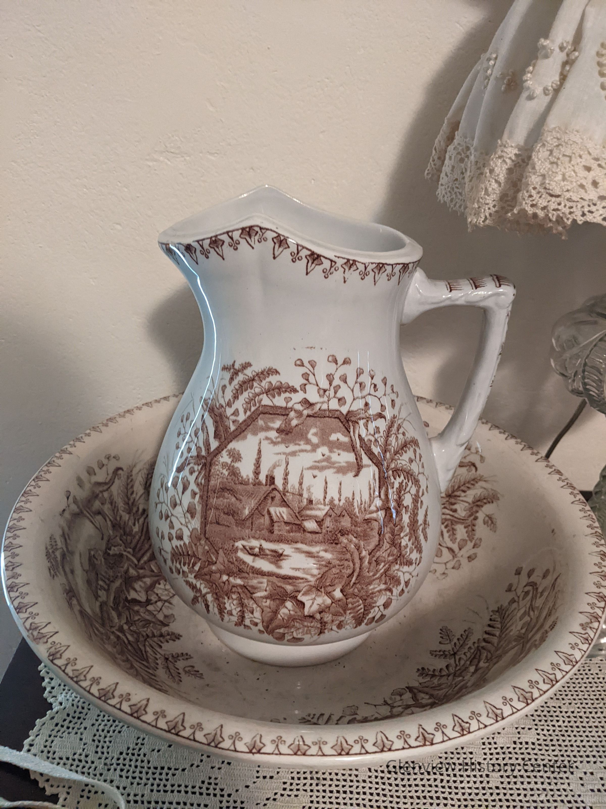 Pitcher - white ironstone: W & Co., Alton Hanley, England - Brown country house scene
