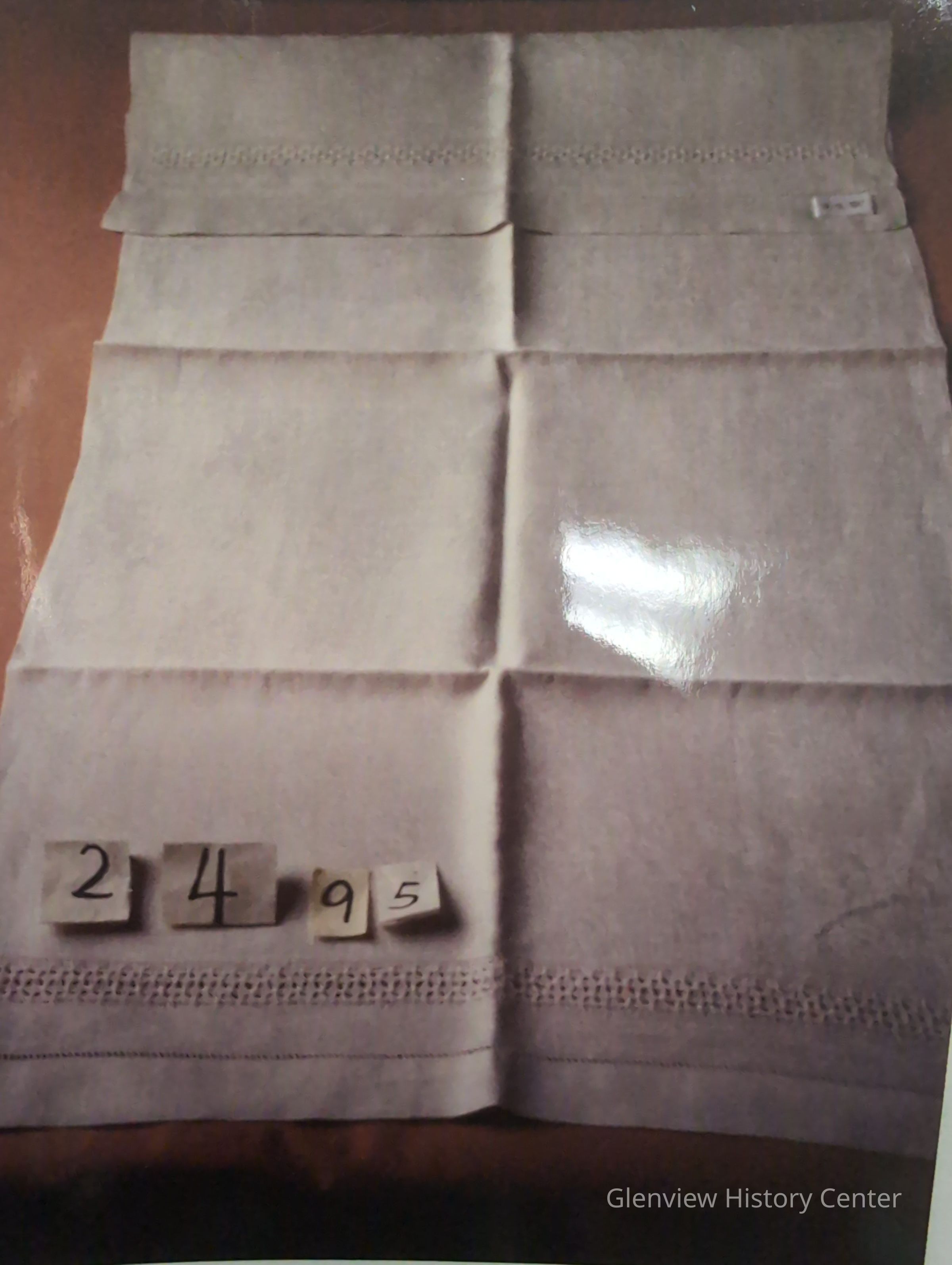 creme colored damask towel drawn work and hemstitching on either end floral pattern (no size given)