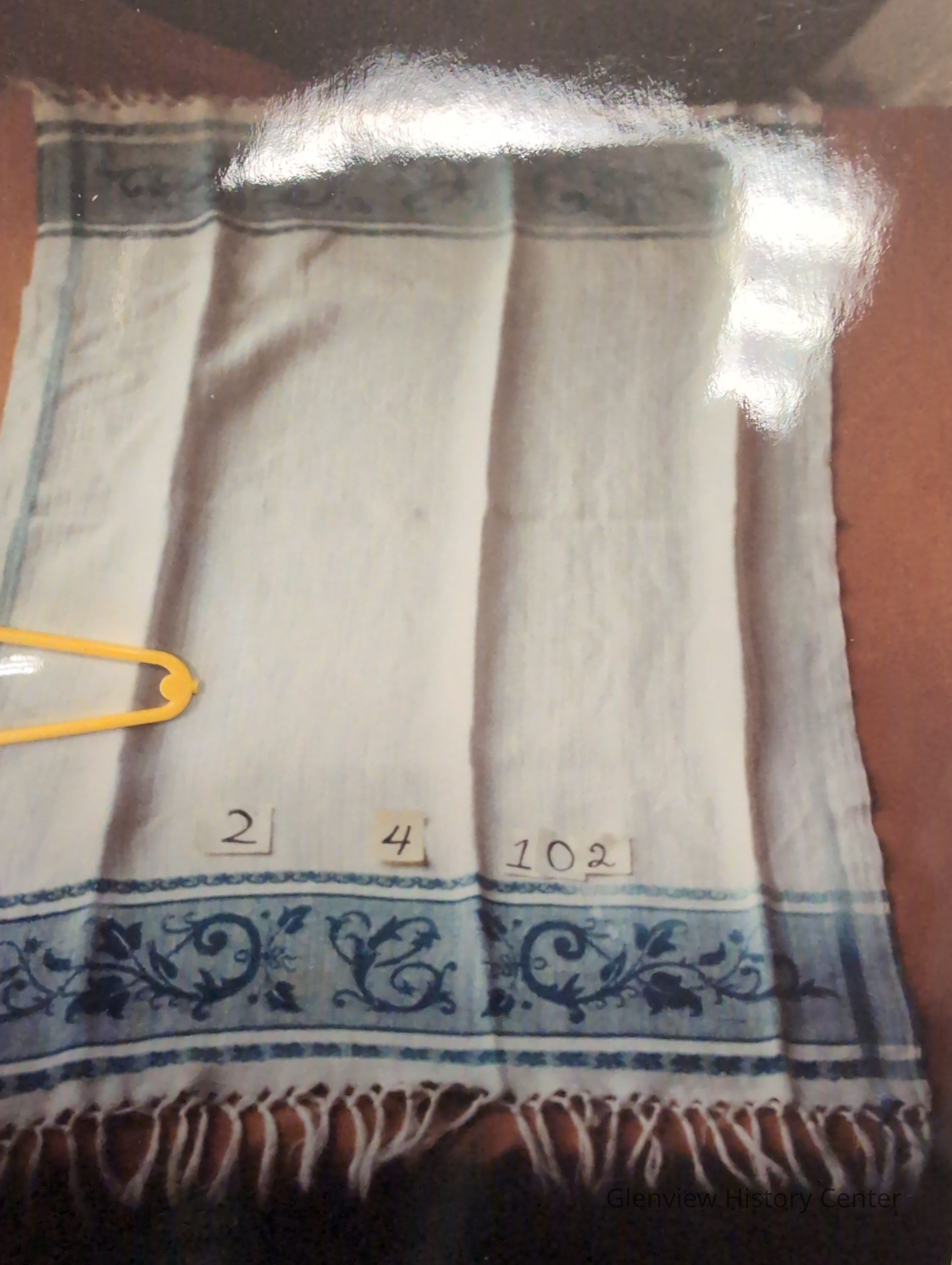 white linen towel 3 1/2" blue damask border and each end and 1/2" blue strip on each side 2" fringe on each end 33"x20" and 2" fringe on each end