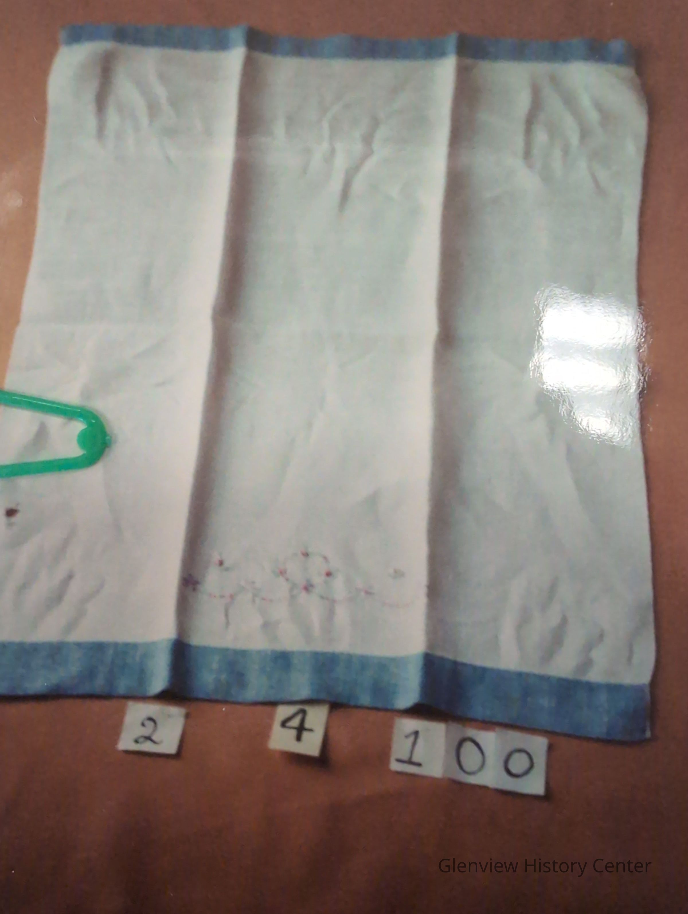 white linen towel with blue hems and lavender pale pink and dark pink embroidery - green leaves 20"x14"