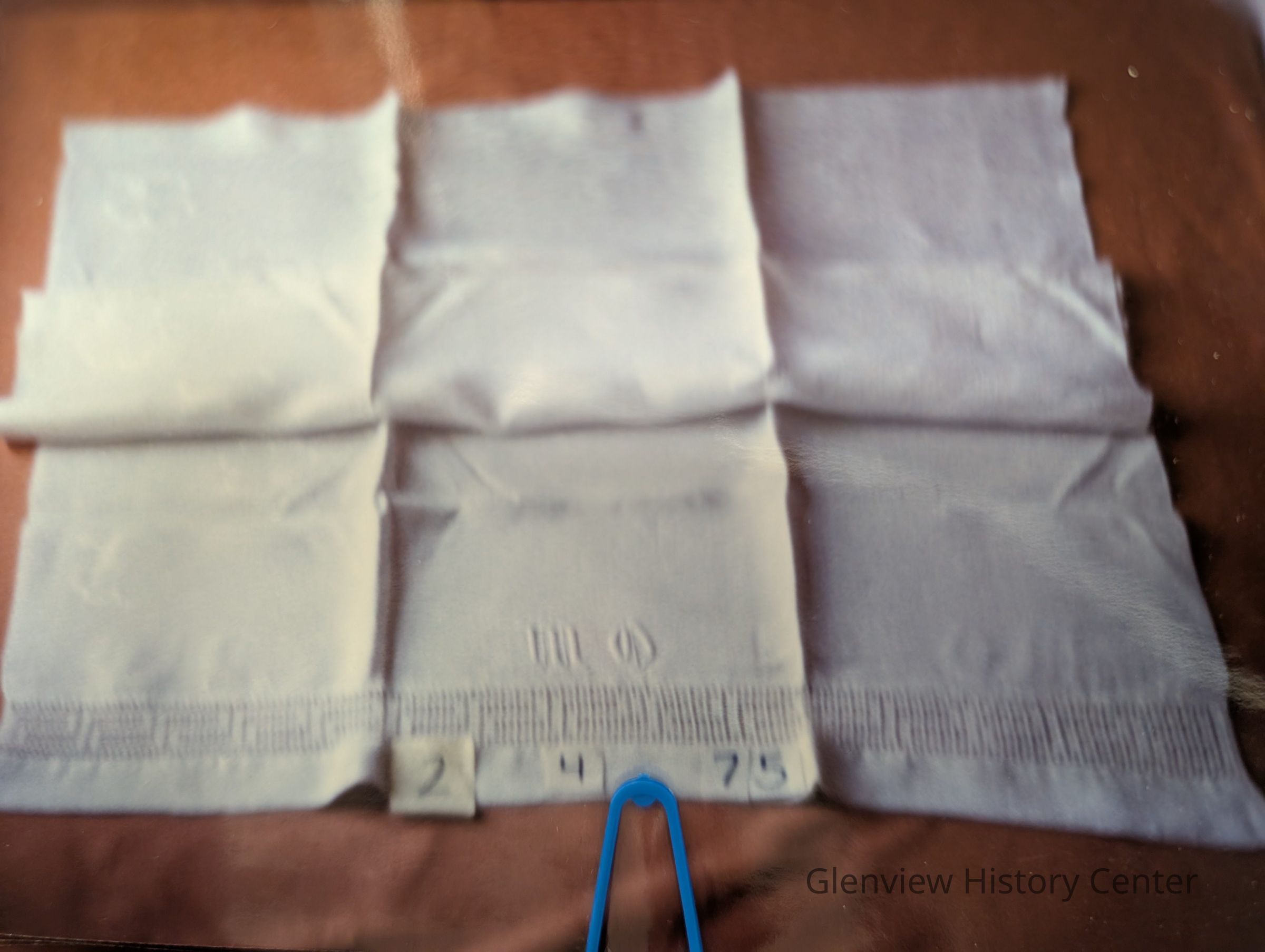 white hand towel, one end crocheted initials MO clover design waffle weave 25x37