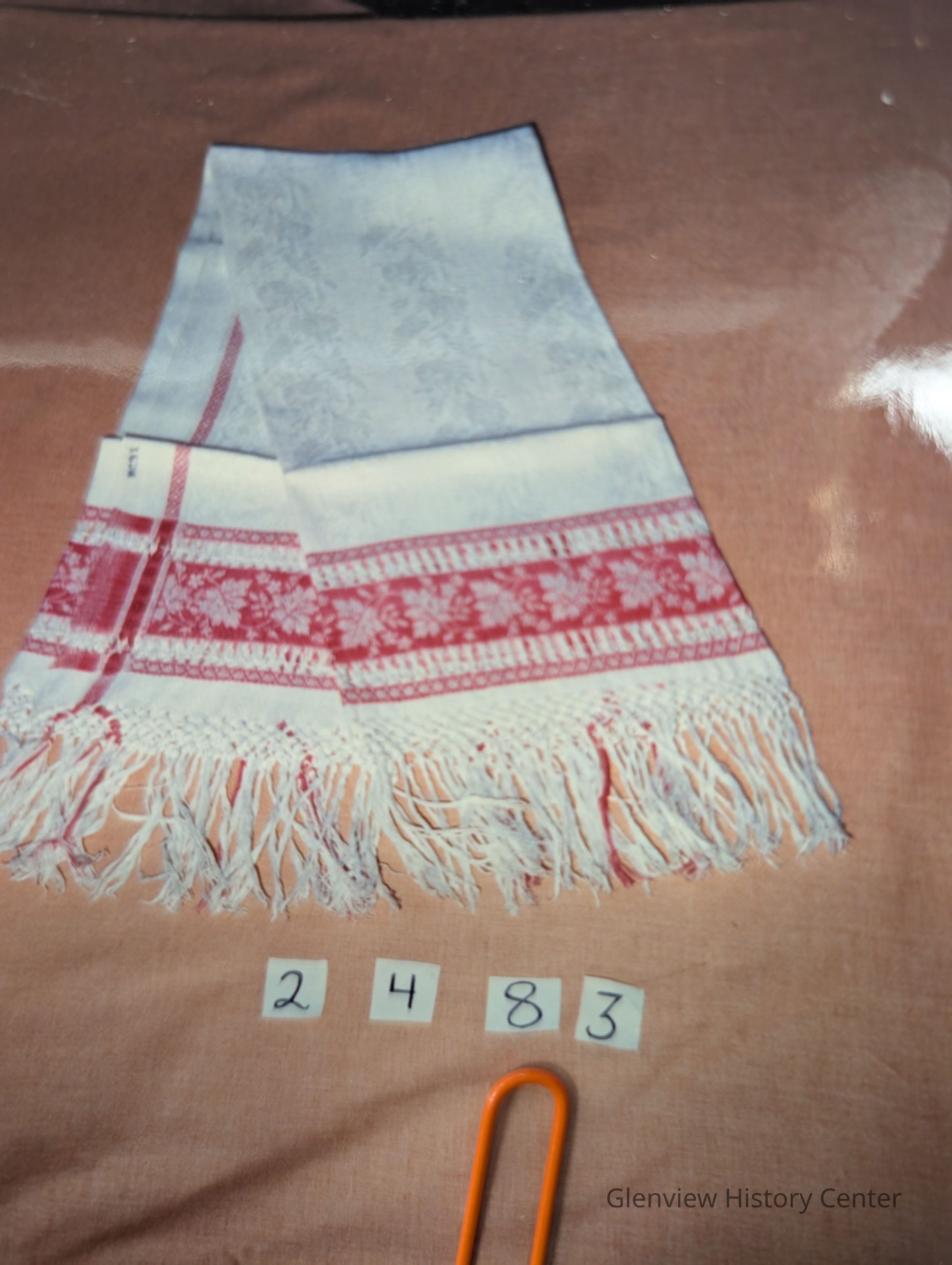 white and red damask towel with 5" fringe