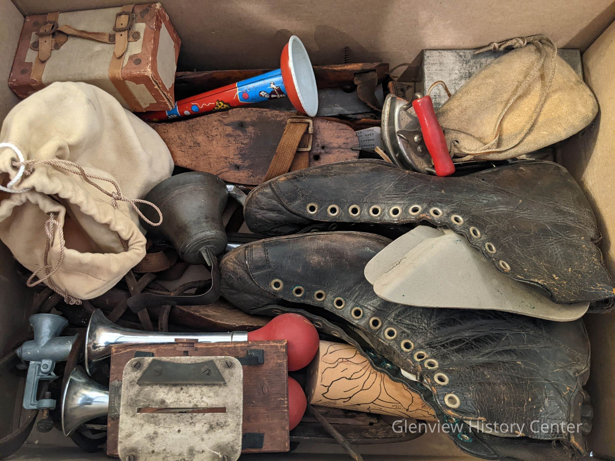 Items moved from the Toy Room during construction. This box includes three pairs of ice skates, metal toys, and a doll.