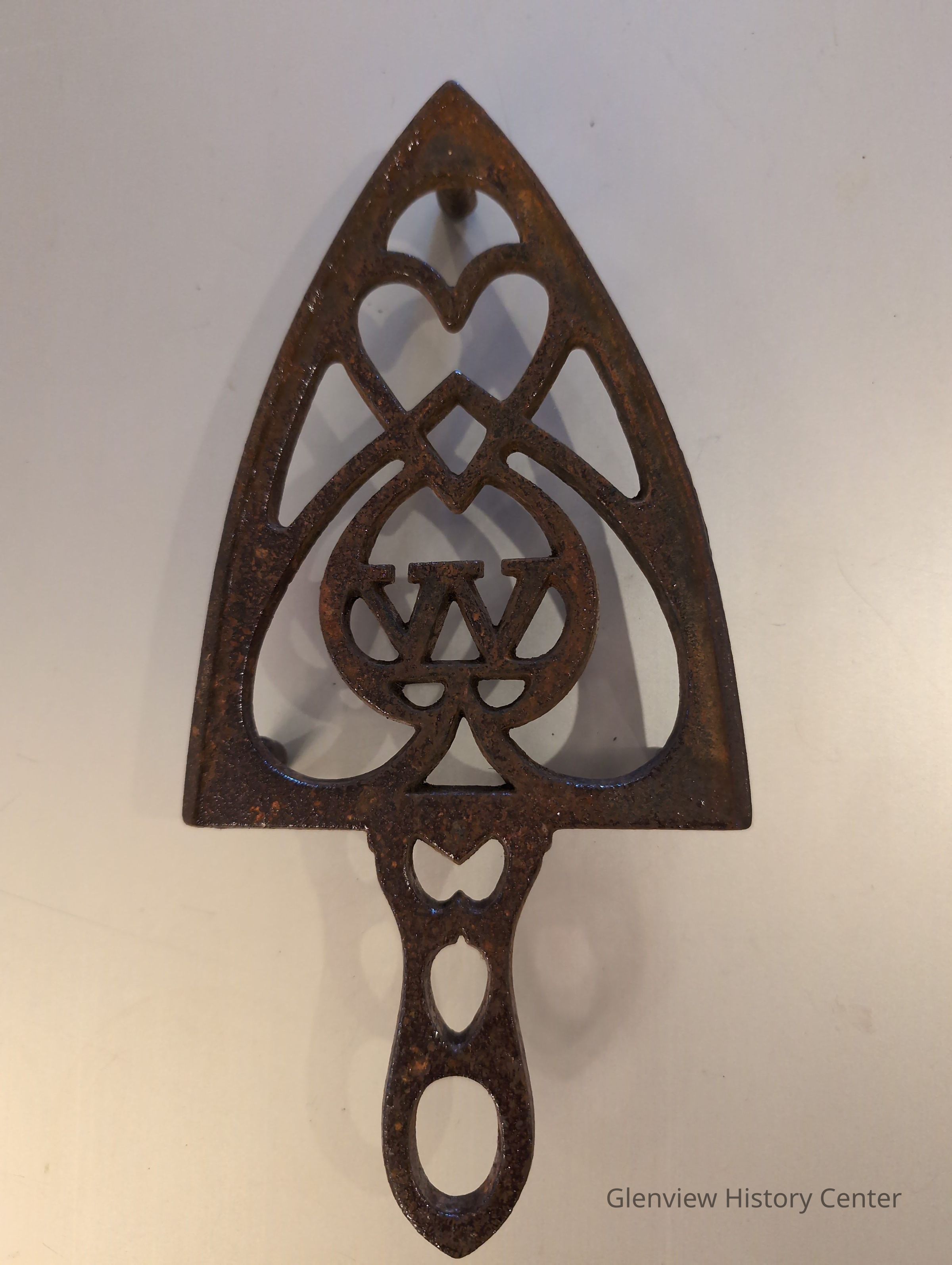 Decorative iron trivet for a pressing iron. Decorations include a heart and the letter 'W.'