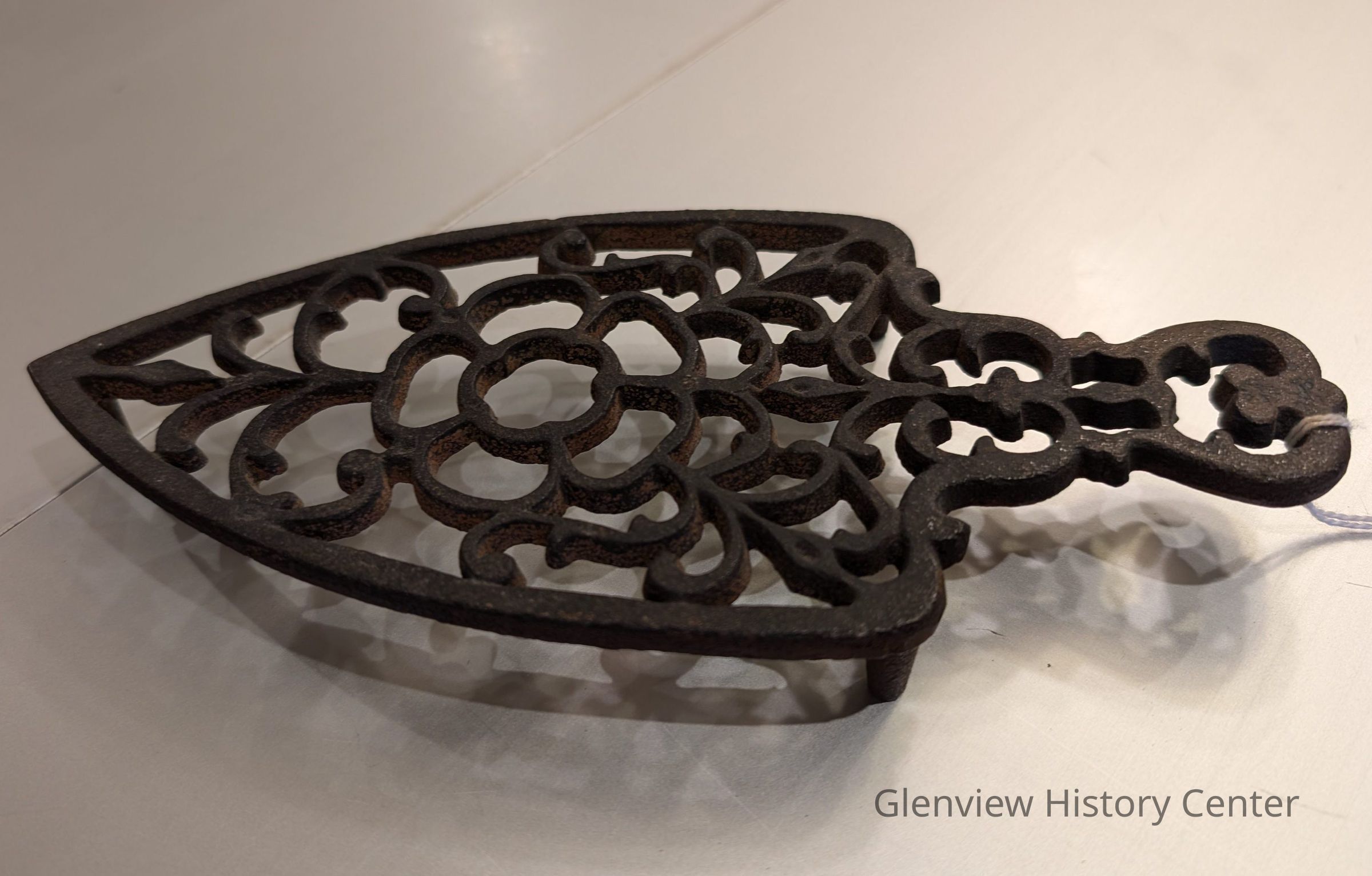 Trivet rest for pressing iron. The rest is a one-piece cast iron piece including the base, three posts and handle. The base with handle is comprised of a filigree design of flower and leaves.