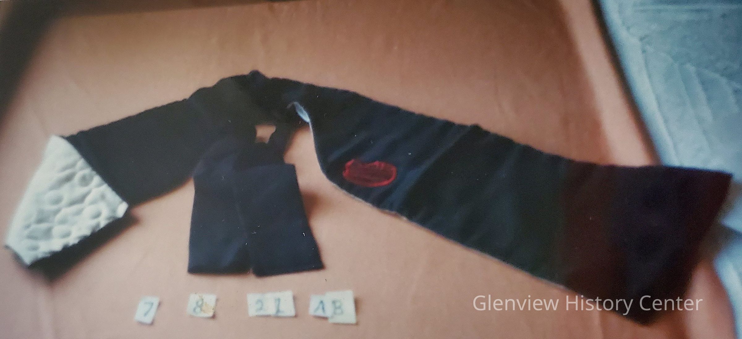 A) Black satin silk with white on reversible white quilting. Red Monogram. Vest-like. 41-1/2 X 7". B) Black satin jabot with white lining 9" x 3" 2 tie-like with 18" tie bat wing cut.