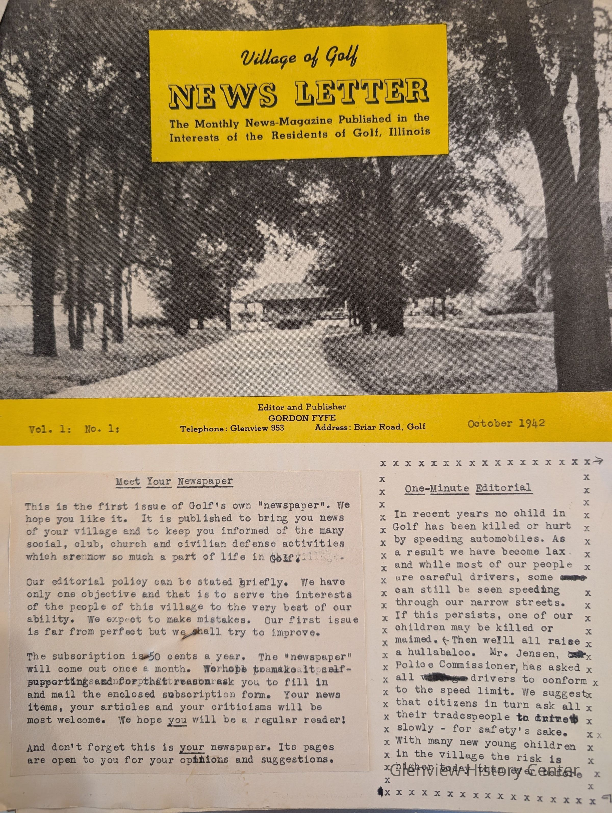 "This is the first issue of Golf's own "newspaper"... It is published to bring you news of your village to keep you informed of the many social, club, church and civilian defense activities which are now so much a part of life in Golf.Title