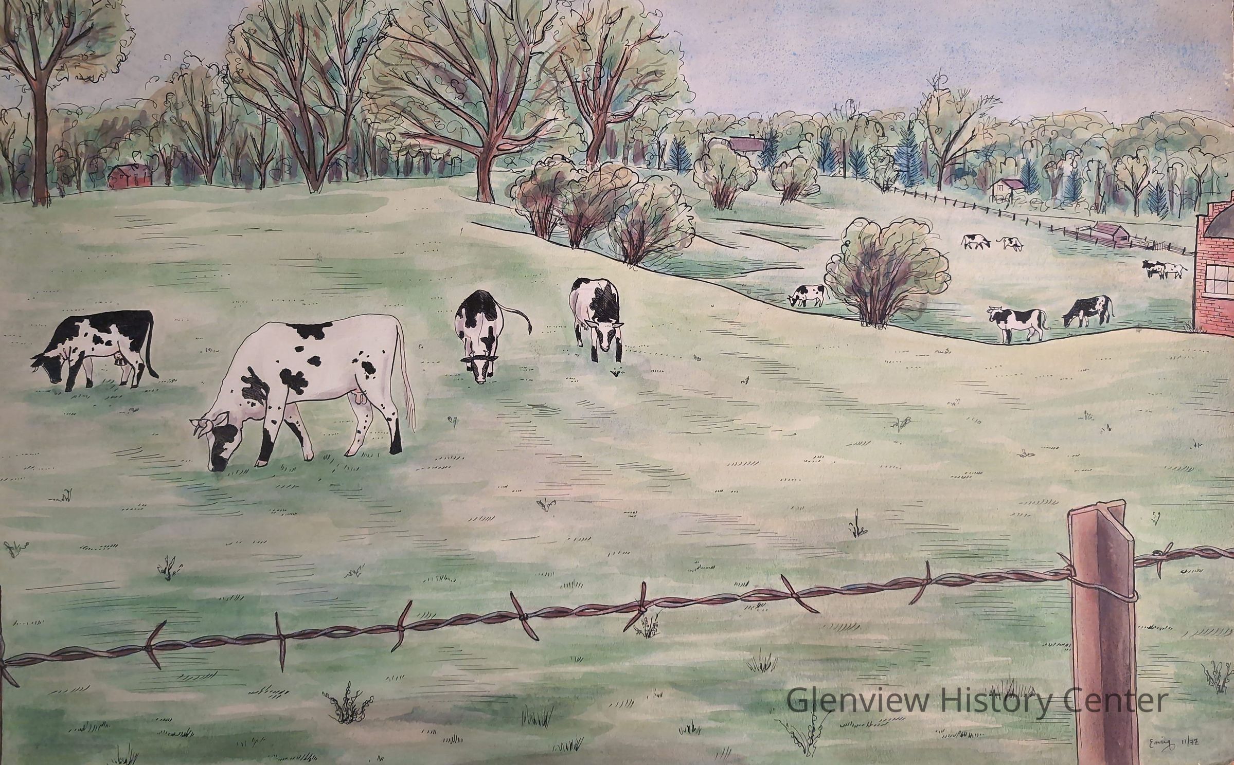 Watercolor painting of a cows grazing on farmland at Wagner FarmContext