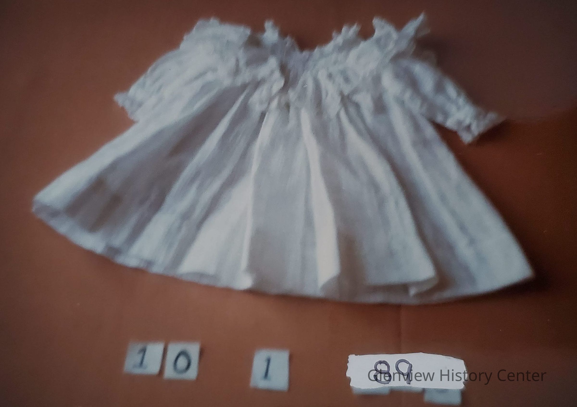 Doll dress; lace stand-up collar, long sleeves puffed with lace edging; blue ribbon inserted in lace insert in yolk; Ruffle in material below lace insert, pointed edging on ruffle edged in lace.