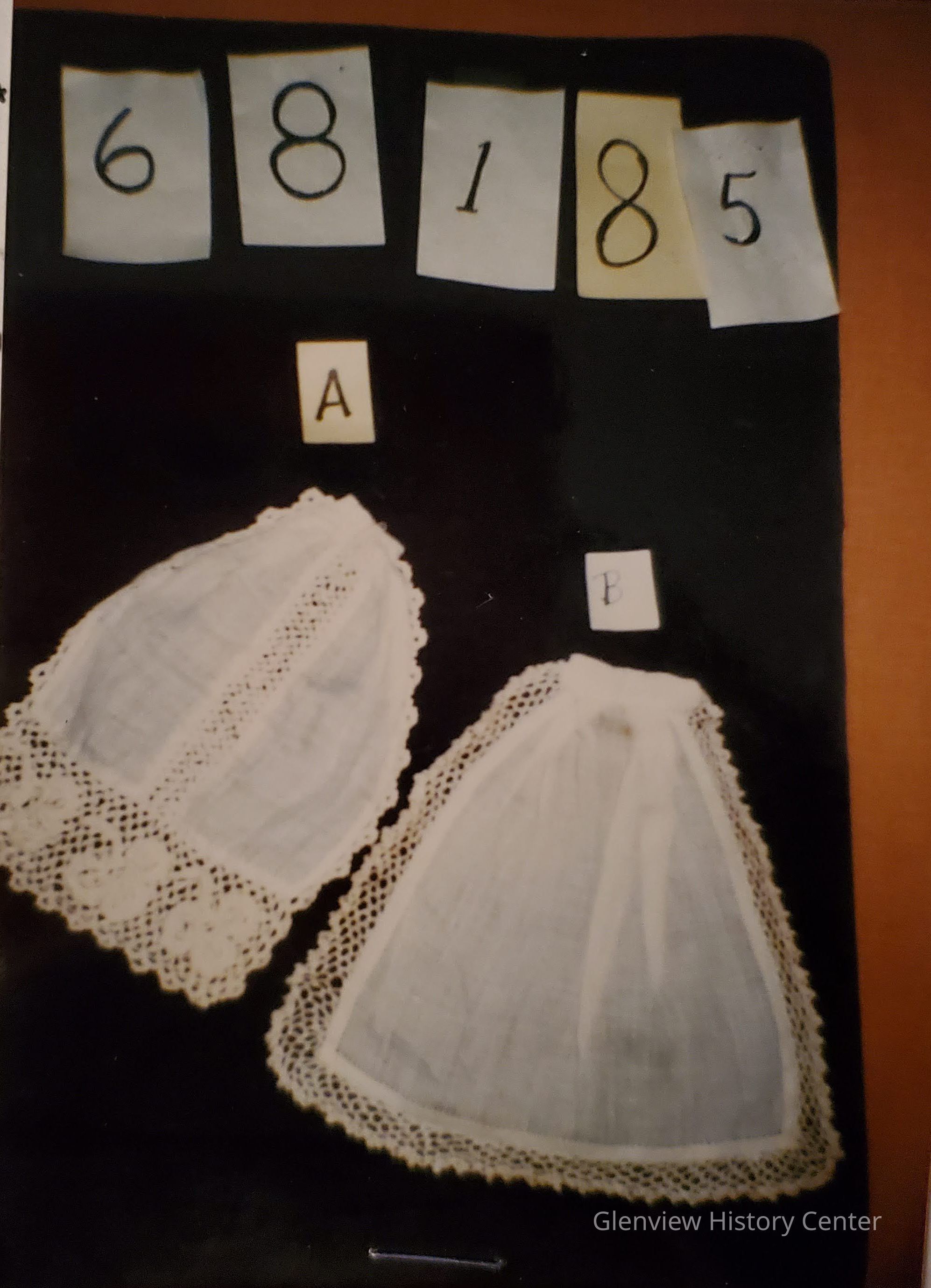 A) has crocheted trimming down center and scalloped sides - 1-1/2" crocheted edging with three scroll designs.