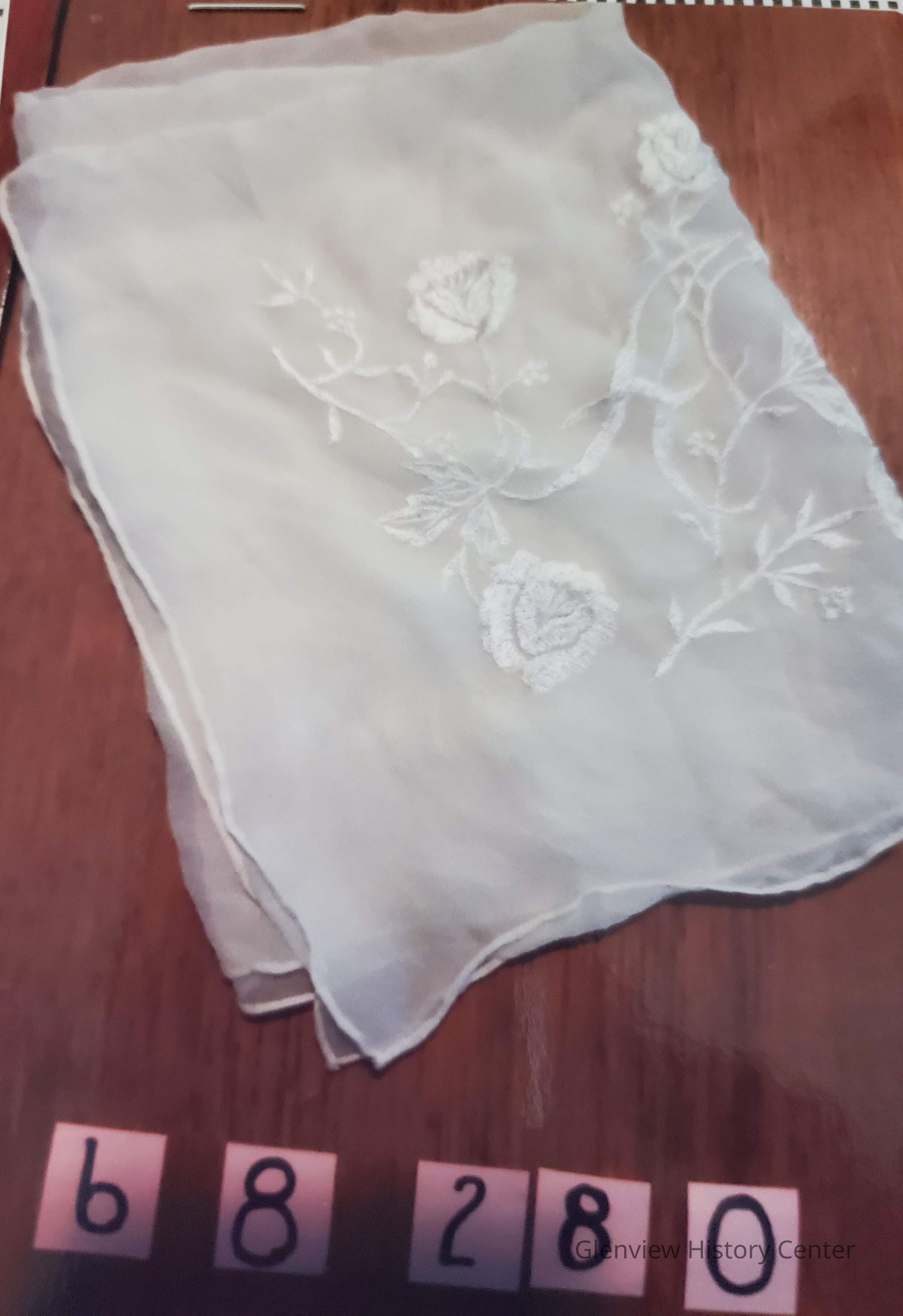 Chiffon scarf, embroidered flowers and "A" in corner.