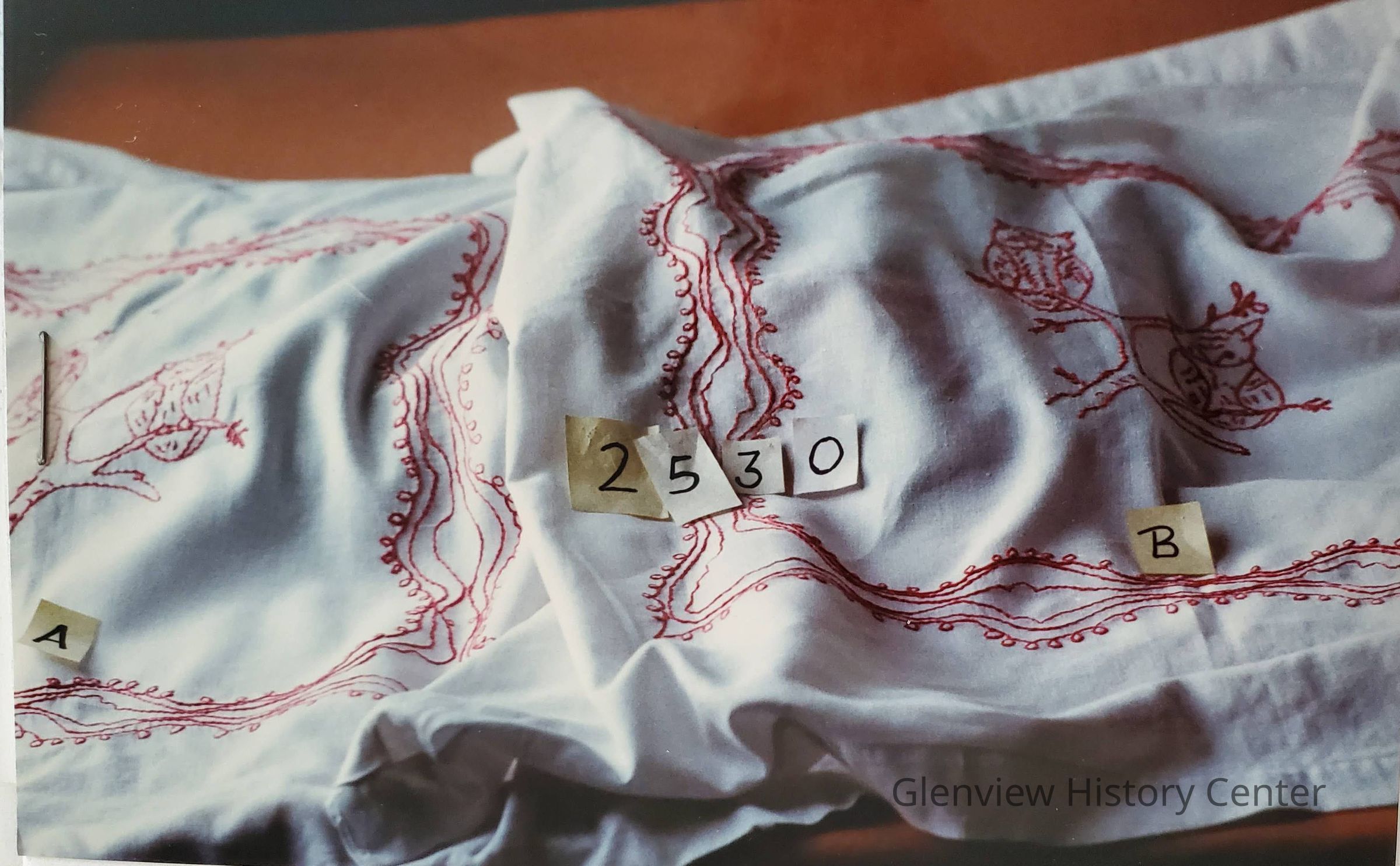 Two cotton white pillow-shams. Two owls on branches embroidered in red.