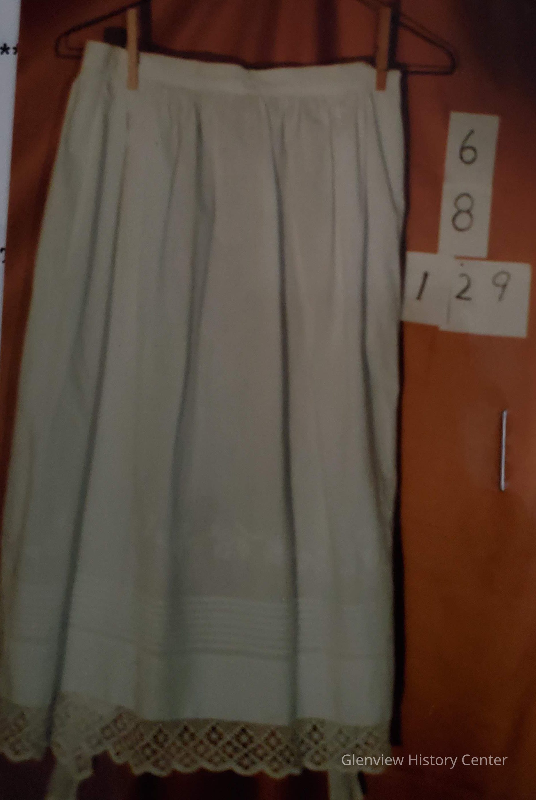 White Cotton apron with embroidered lace hem; 7 circular tiers of self fabric; hand embroidered white on white roses and winding vines, located above the tiers is outline stitch.