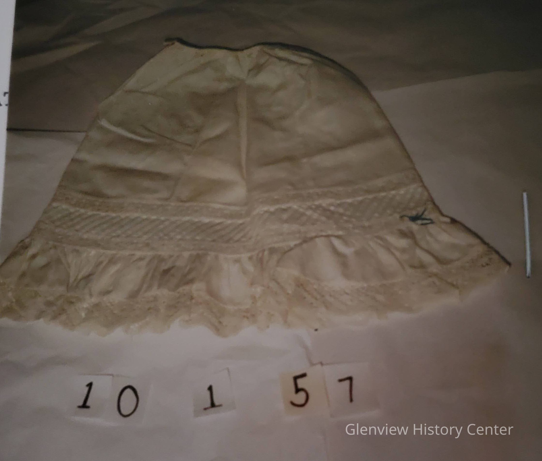 Doll fine cotton, sheer petticoat drawstring top; flared skirt - machine stitched 3" lace insertion band above ruffled hem, 1" edge: Skirt length 12-1/4"