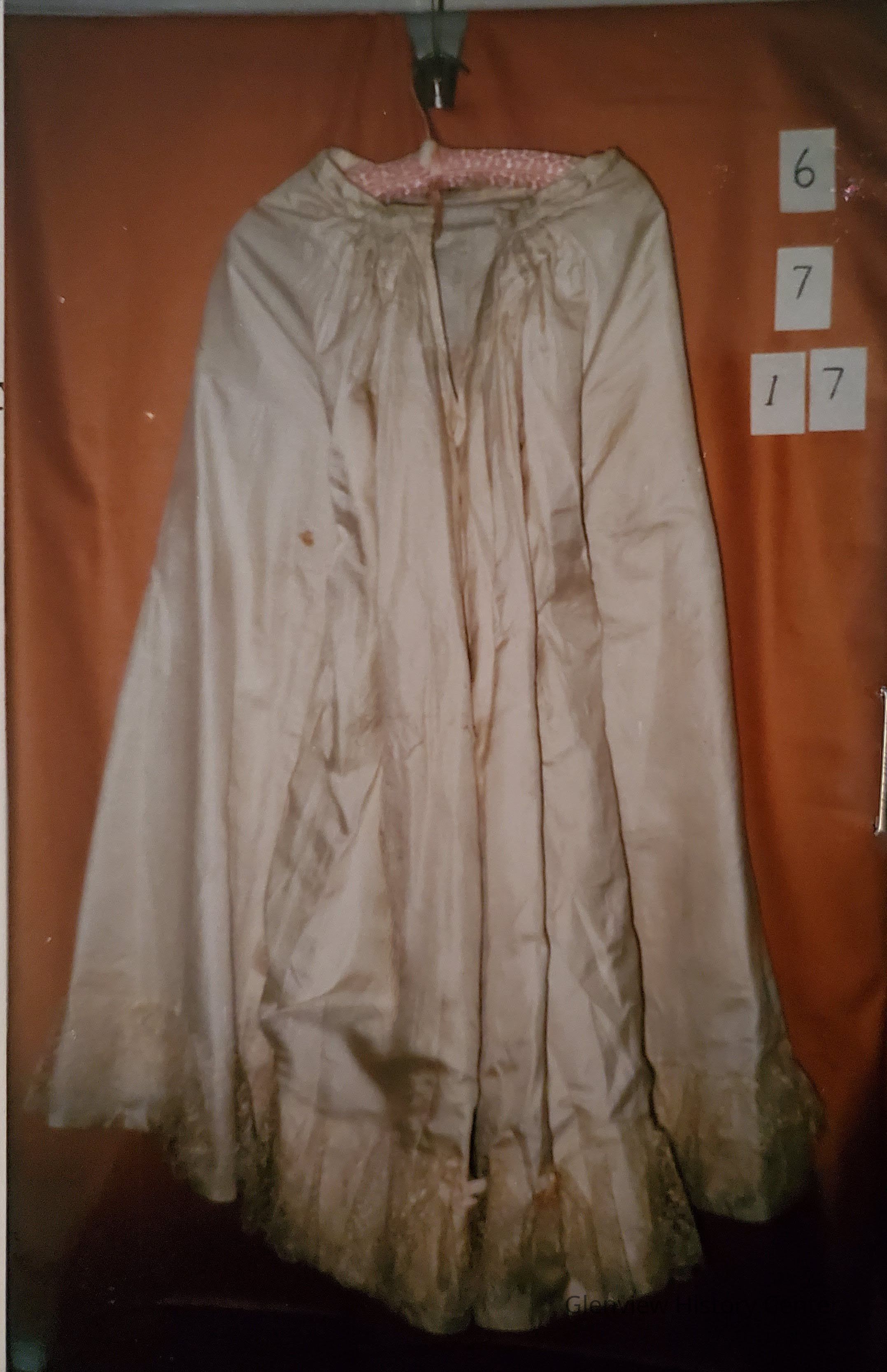 White Faille Bustle Skirt with Ruffle of Machine Made Ecru LaceDescription