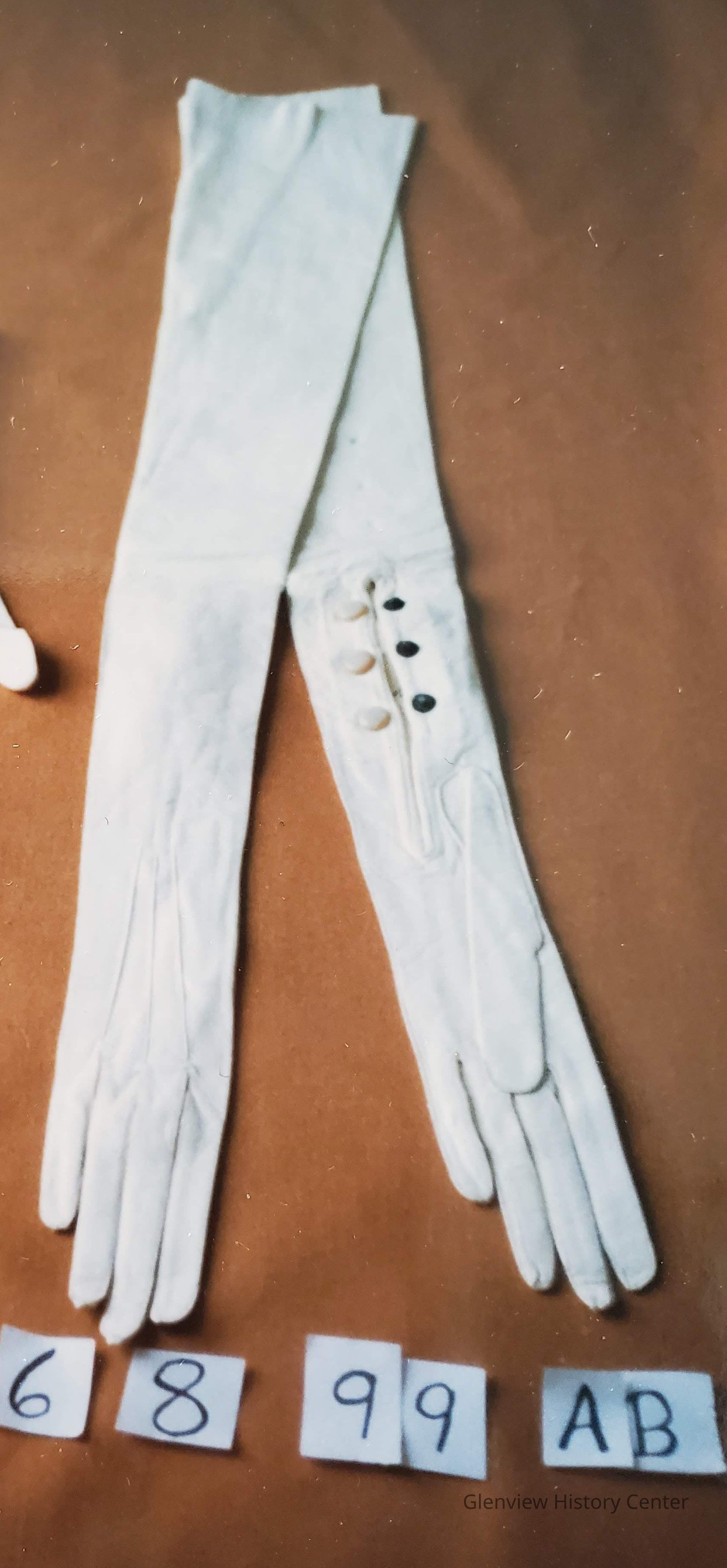 23" length white kidskin; mother of pearl: 3 stitched ribs on back of glove; fingers and seam over stitched by machine. Long white leather with three pearlized snaps. size 5-1/2, made in Germany.Acquisition