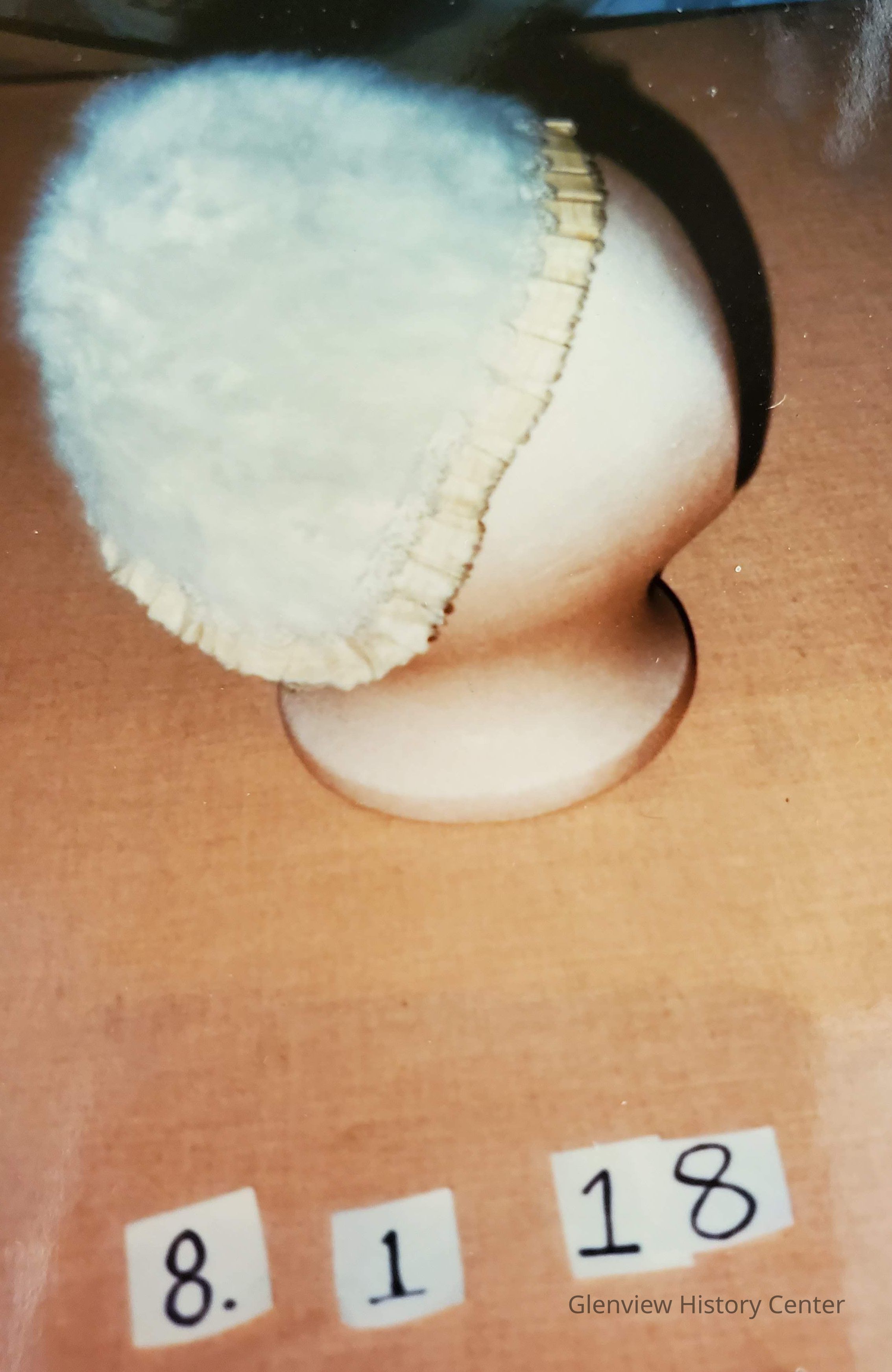 White lamb's wood bonnet, pleated ribbon ruffle - crocheted edging, scalloped.