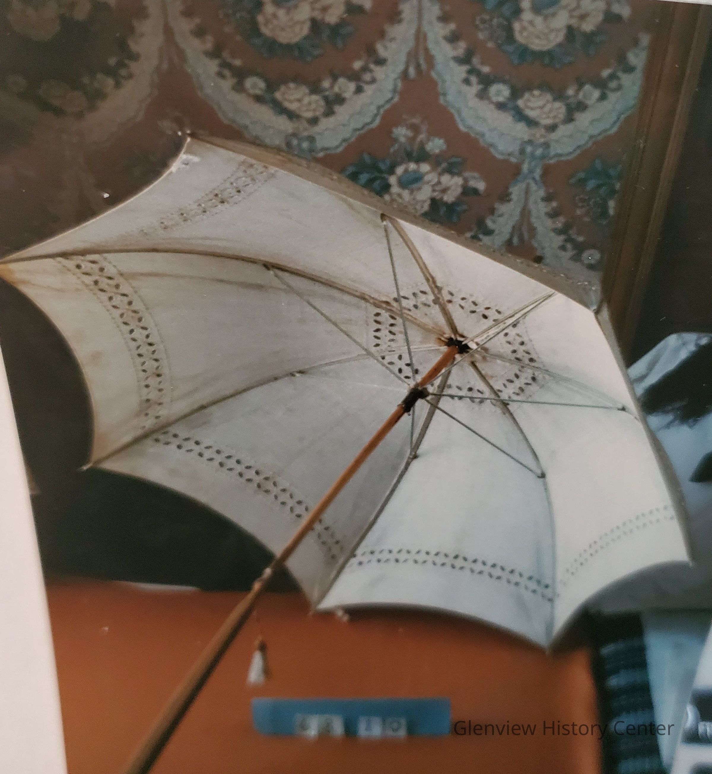 White linen with eyelet daisy design in two rows-one at top and one at edge, handmade, square wooden handle.Acquisition