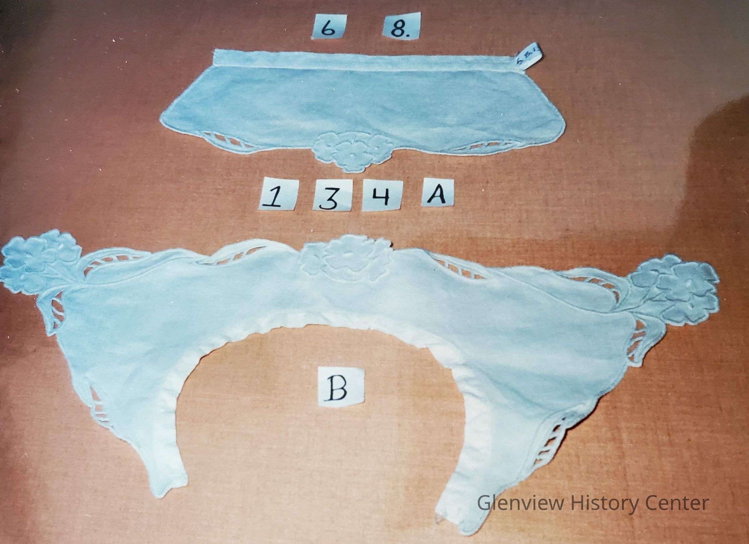 Round neck collar about 3" deep. Cuff 5" deep. Linen cutwork collar.