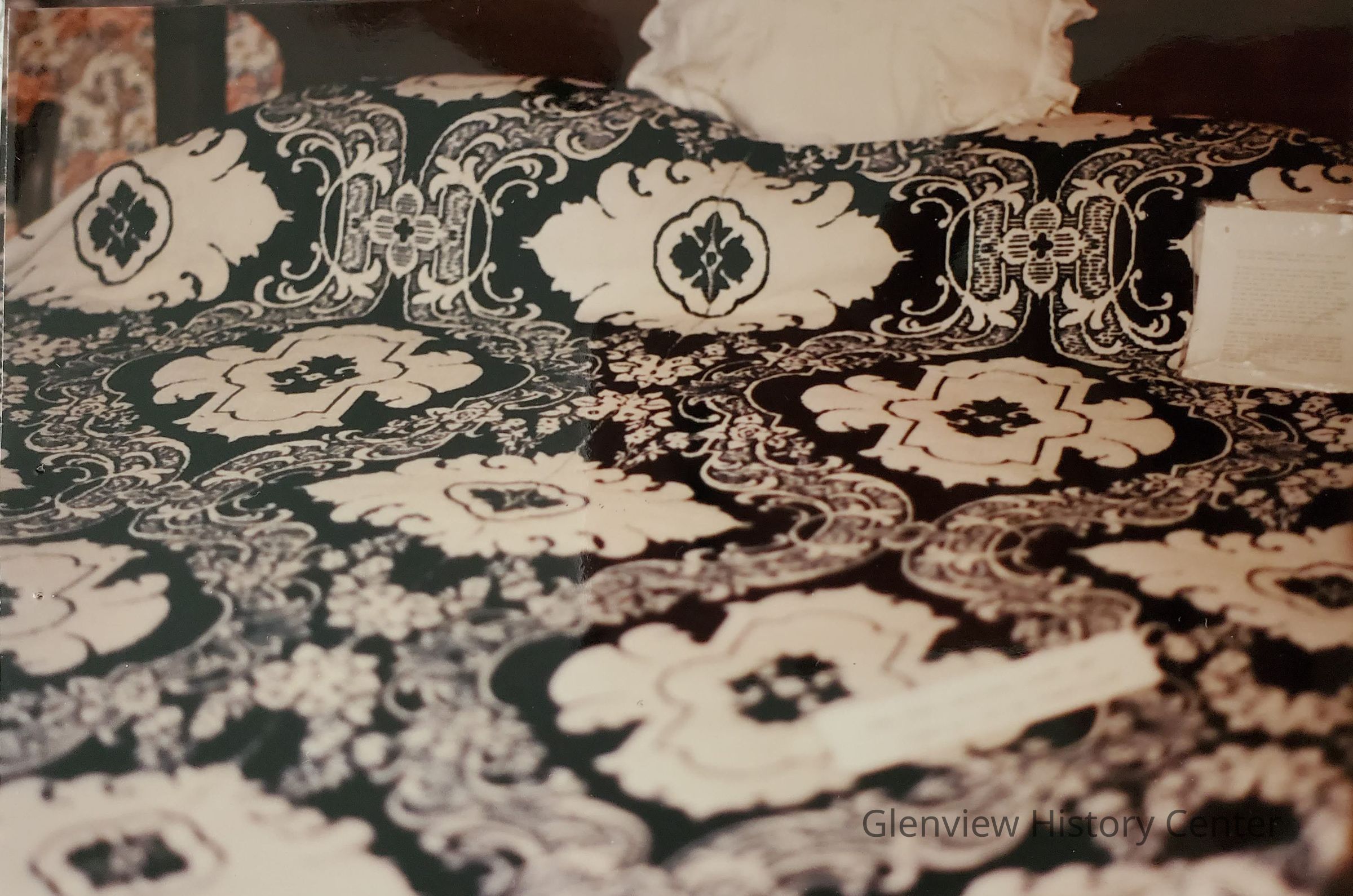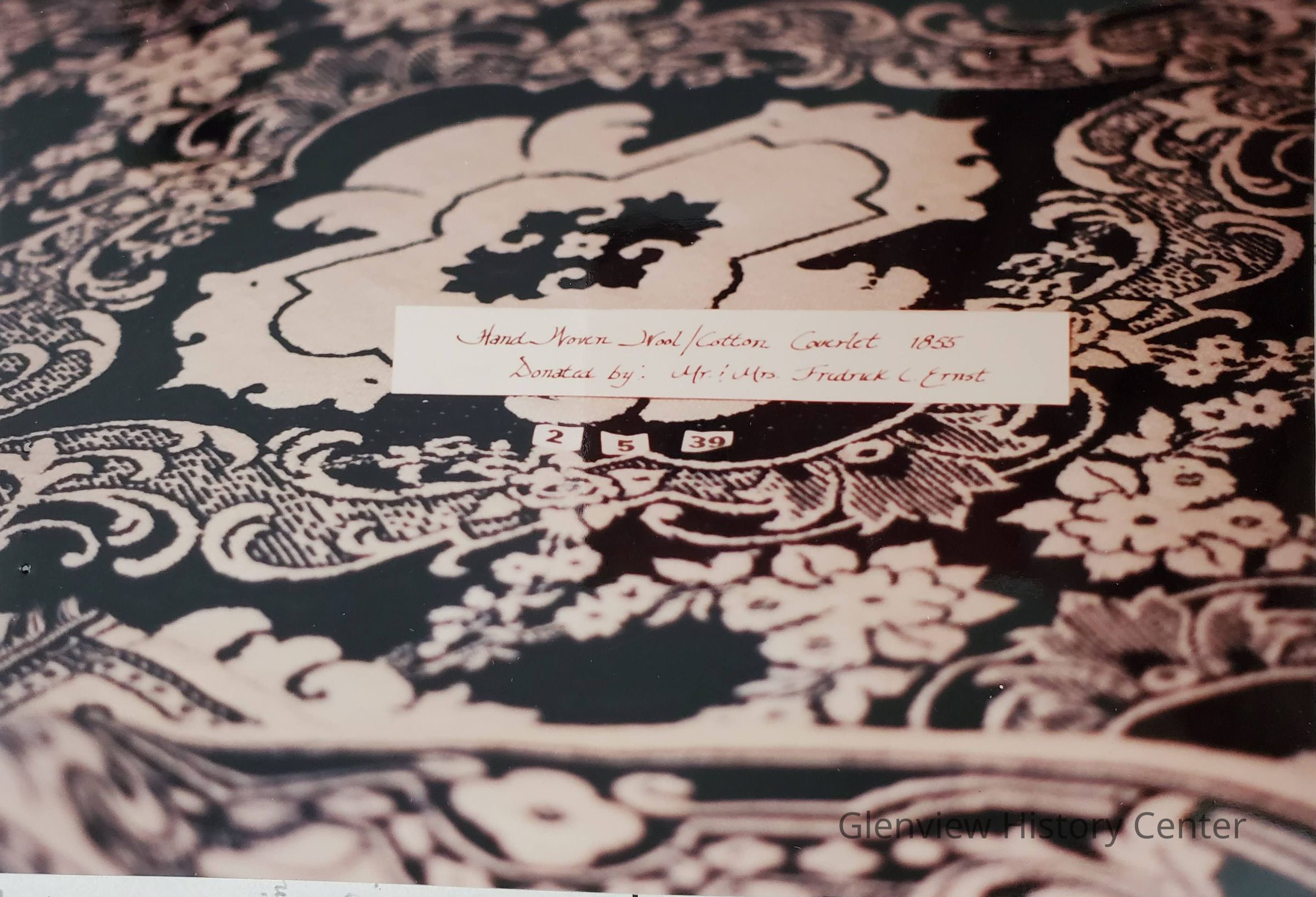 The double coverlet was woven in two strips to accommodate the width of the loom. The patterns were brought from Scotland and were of strips 15" X 3-1/2" of heavy cardboard, perforated much like piano rolls. The strips were numbered and joined together with thread and turned on a metal cylinder whose needles fitted into the perforations. There were many treadles and the weaver had to feel for the pedals with his foot, throw the shuttle, reach up to catch without looking the proper one of the many linen "hand holts", release it and catch the returning shuttle. The double coverlet repeats the pattern on the reverse side with the colors reversed.