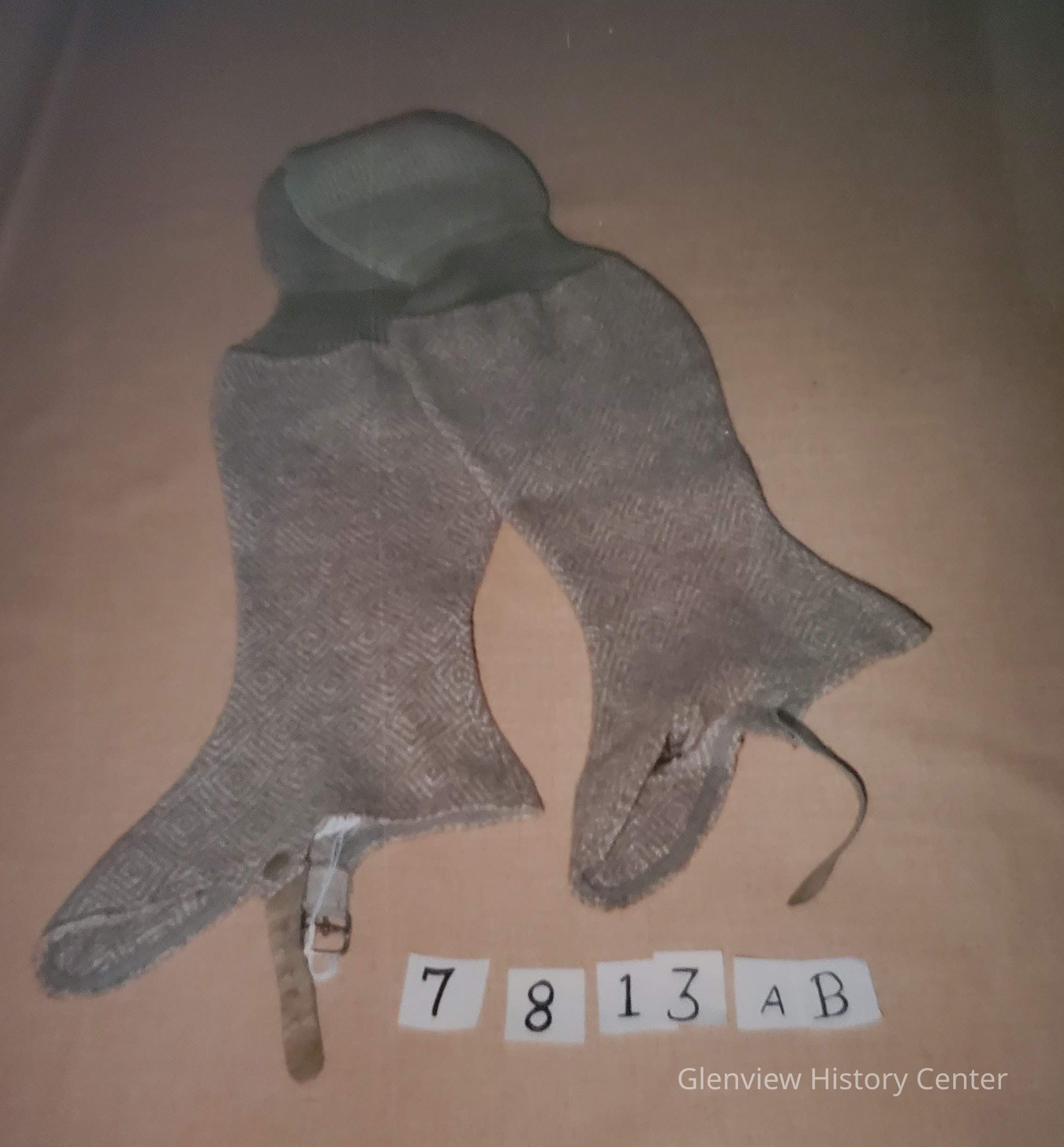 Shaped at foot with leacher buckles, 3-1/4" long; 2-1/2" smaller knit over knee and 4" knit above knee.