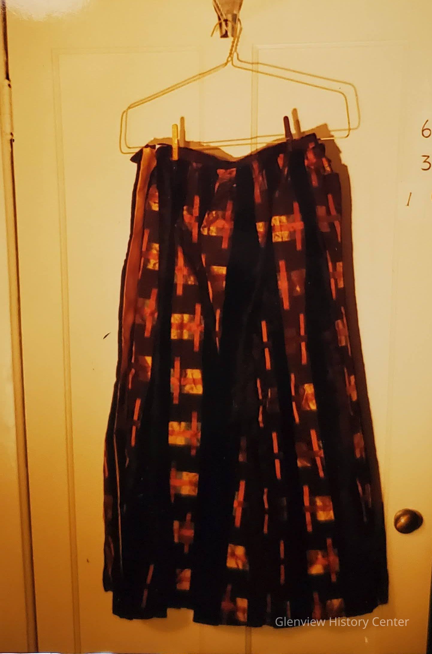 Long wrap skirt - cotton velvet stripes applied to novelty print taffeta (yellow gold, teal blue, and copper iridescent): Center back close; fabric-brown cotton velvet stripes in a pattern repeat of 3, 2-1/2" stripes to 1, 1" stripes; taffeta stripes are all 2-1/2" wide; 3/4" width self waistband with 1 hook and eye close at center back; construction: is a wrap skirt; box pleat at center front followed by 12 regular pleat 2", smaller pleats at center back; front and back length is 38-1/2"; 21" wide center front panel; side panels are 19" wide; back panel is 18-1/2" wide; center back has a gold satin interfacing which is 3" wide at waistline; 6-1/2" wide at middle or 19-1/4" below waist; bottom is 8" in width of gold satin.