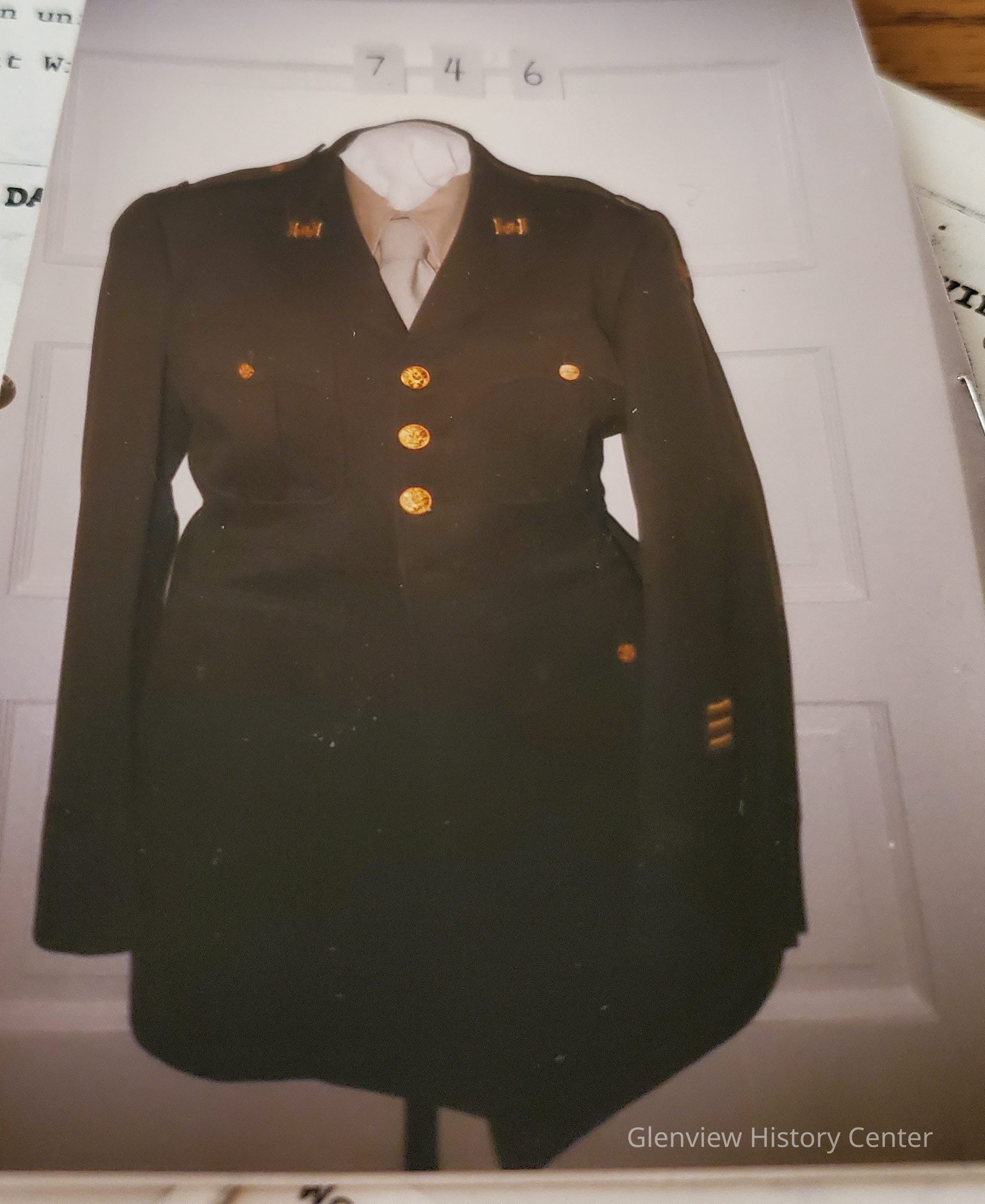 Brown khaki jacket of army engineer uniform. Front opening fastened with 4 buttons 7/8" in diameter (3 brass and 1 brown button). Four pockets have button flaps. Three brass buttons of 5/8" in diameter (one button missing). Two buttons of 5/8" in diameter on shoulder straps. Shoulder straps 1-5/8" wide x 6-1/4" long attached at top of shoulder seam. Button holes in shoulder straps are 3-3/4" from shoulder seam thru which shoulder buttons protrude. Brass buttons embellished in design of eagle. Ribbon braid 1/2" wide brown is attached 3" above ends of sleeves.General Notes