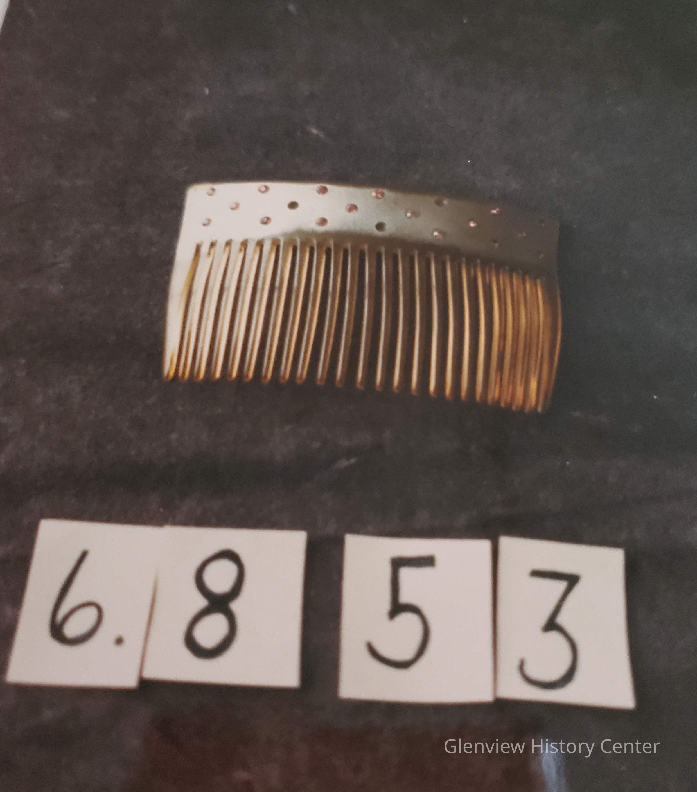 Hard plastic hair comb of a plastic type material of a clear yellowish color. The top set with pink rhinestones.