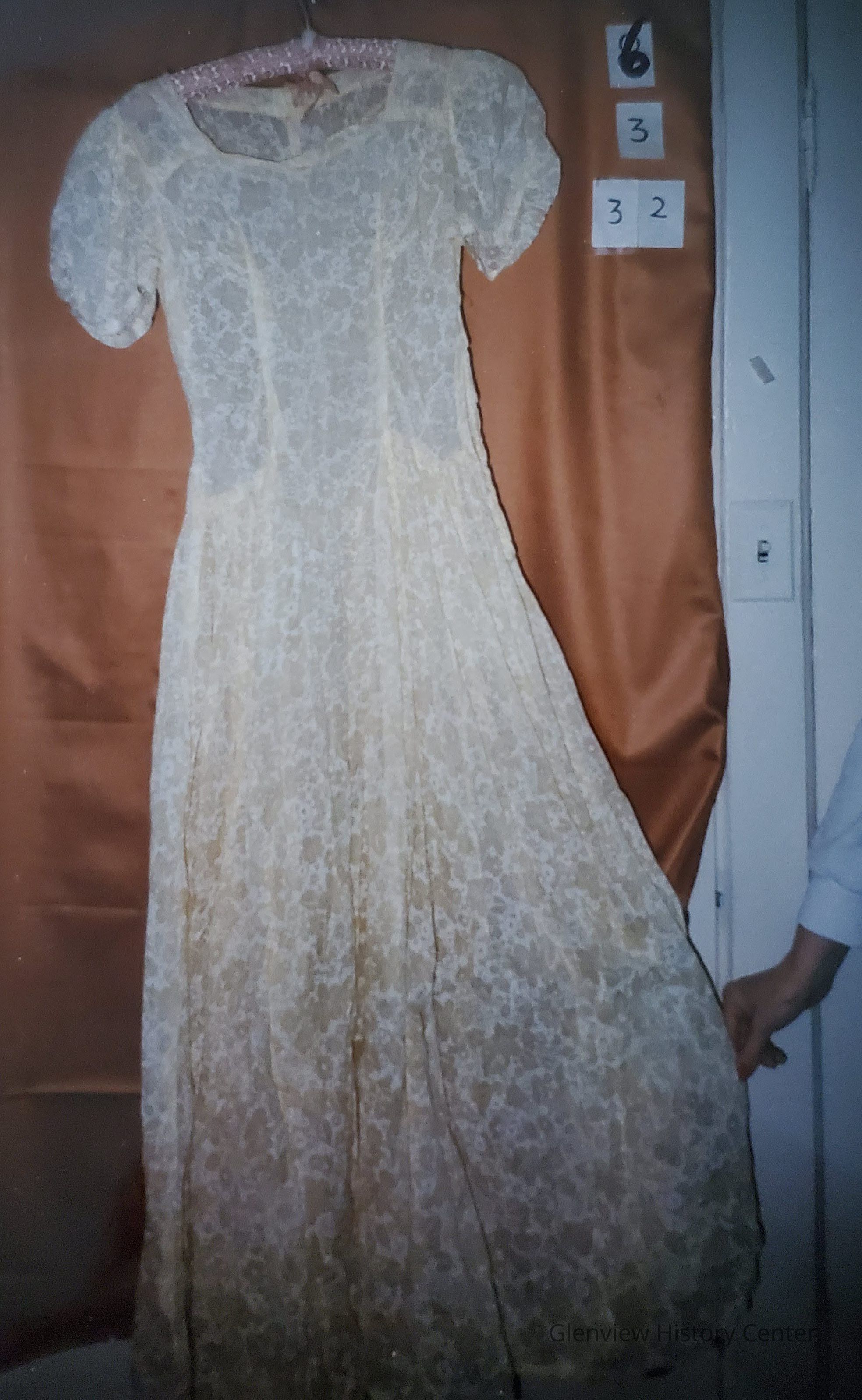 One yellow floral printed full length cotton summer sheath dress with short puffed sleeves with 4" gathering on back of sleeve where outer seam would be - hem on sleeves is rolled 3/8" - hemmed and top stitched to outer sleeves. Five pleats on sleeve cap. Neckline is a square slight "V" center front. Four inch dropped shoulder 2-3/4" wide. Dropped waistline with gathering on hips and across back. Center front panel is 7" at neckline and 5" at waist. A bust-line dart seam extends from gathering at hemline to bust point and gathered in the bust area - smooth through torso line - very narrow top stitching - less than 1/8". Dress back has center back seam, 19" long from neckline to gathering at hip line. 3-1/4" from either side of center back is a 9" seam dart. Left side opening of 12" has 3 snaps and 1 hook and eye. Skirt length is 36" with ruffled hem of 3/8" and top stitched and hand stitched a triangle gore located in center back 22" from them. There are two triangles of 16" width to the hem line. The triangle on left center of back has two pieces to create the 16" width to match the triangle on right center back with 16" triangle insert between. There are 6 gore panels in skirt and skirt is 206" in circumference.