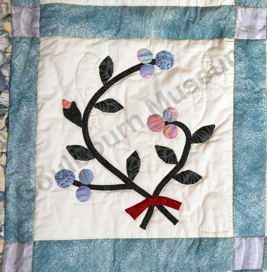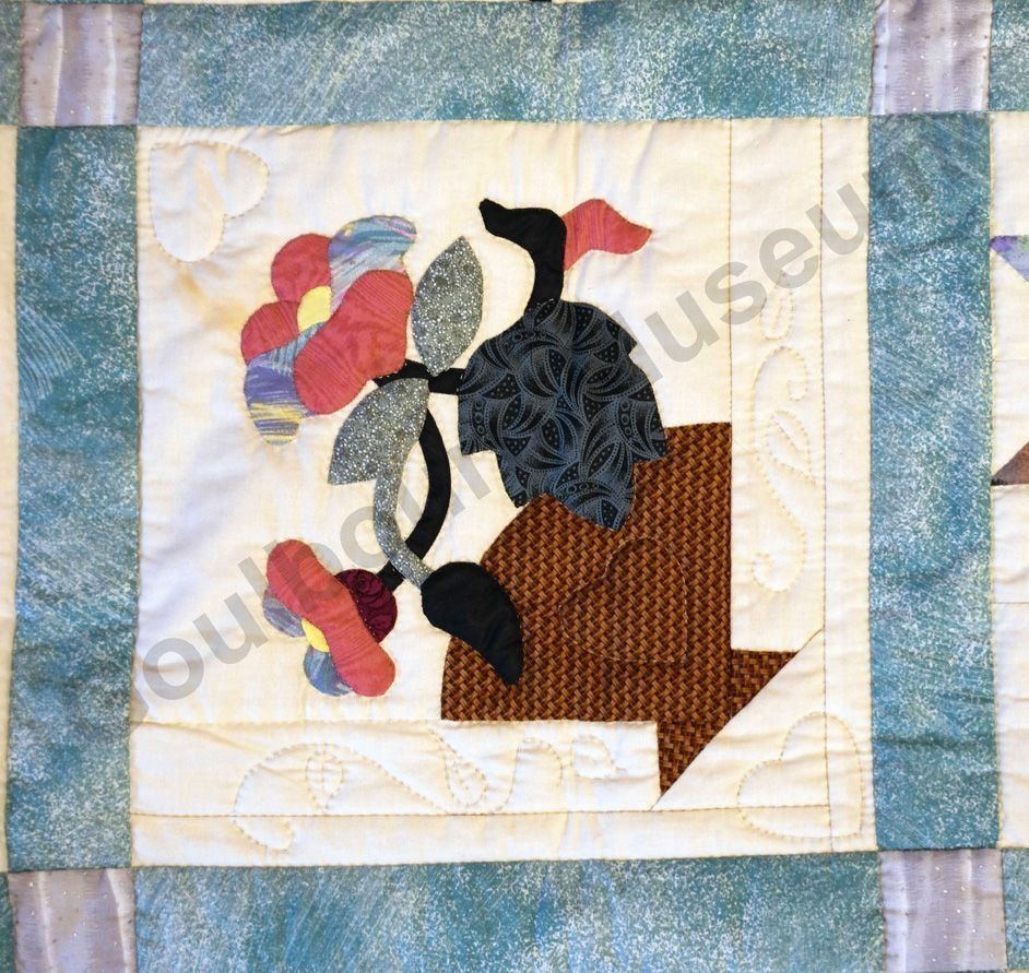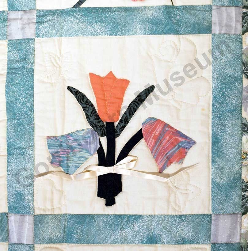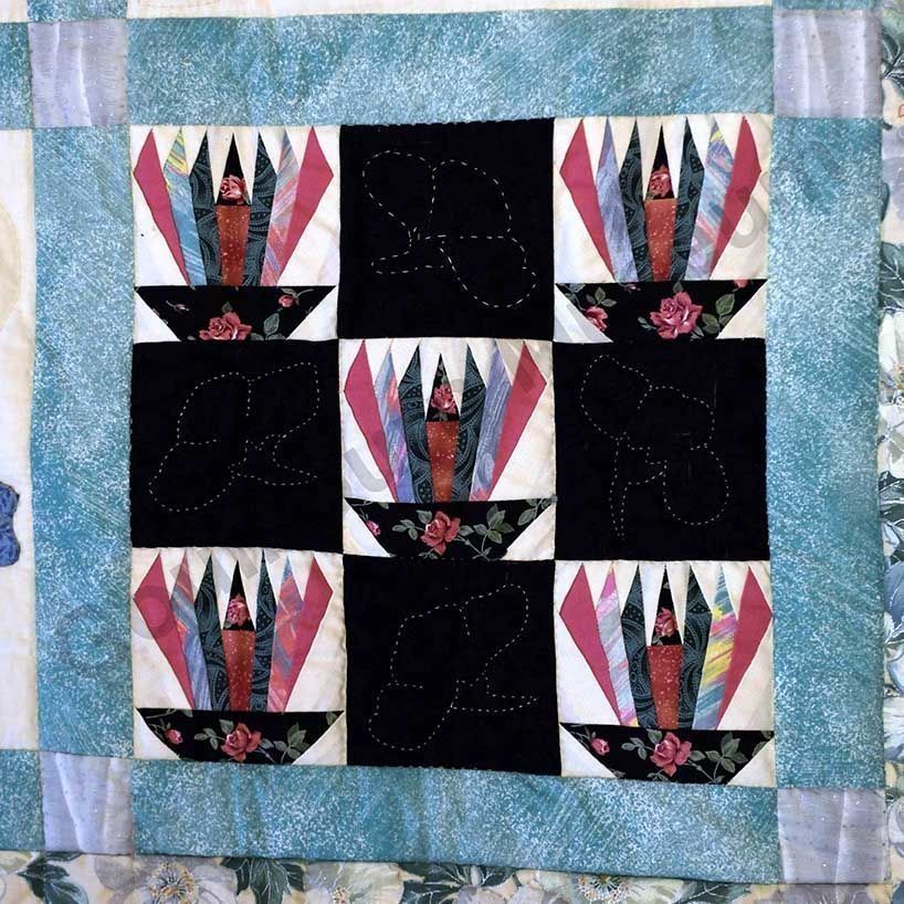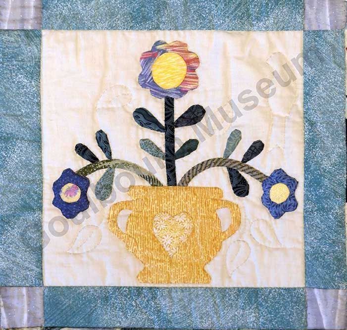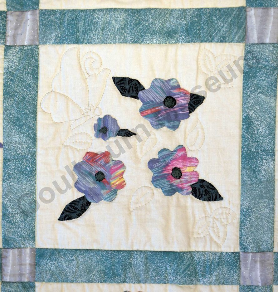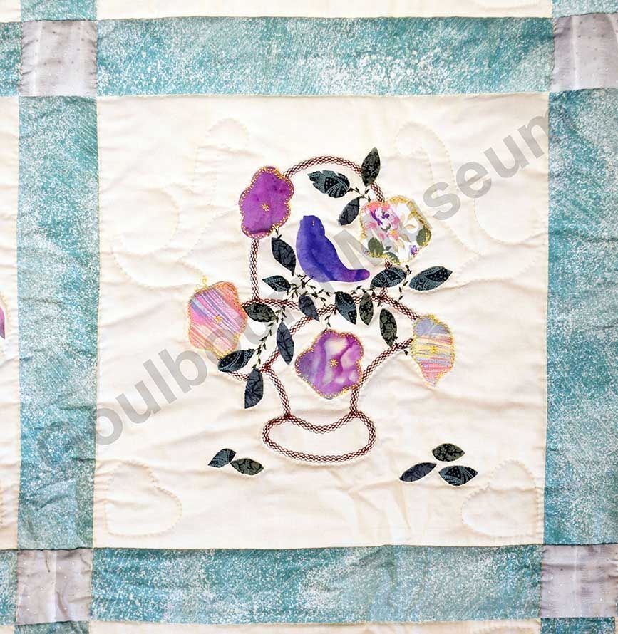 1st challenge quilt made by the guild in 1999/2000. Each block made by different members and hand quilled by the group.Collection