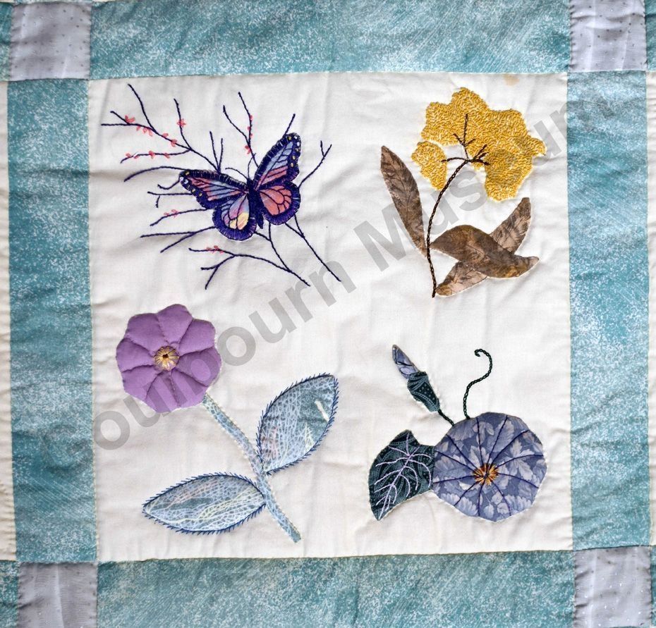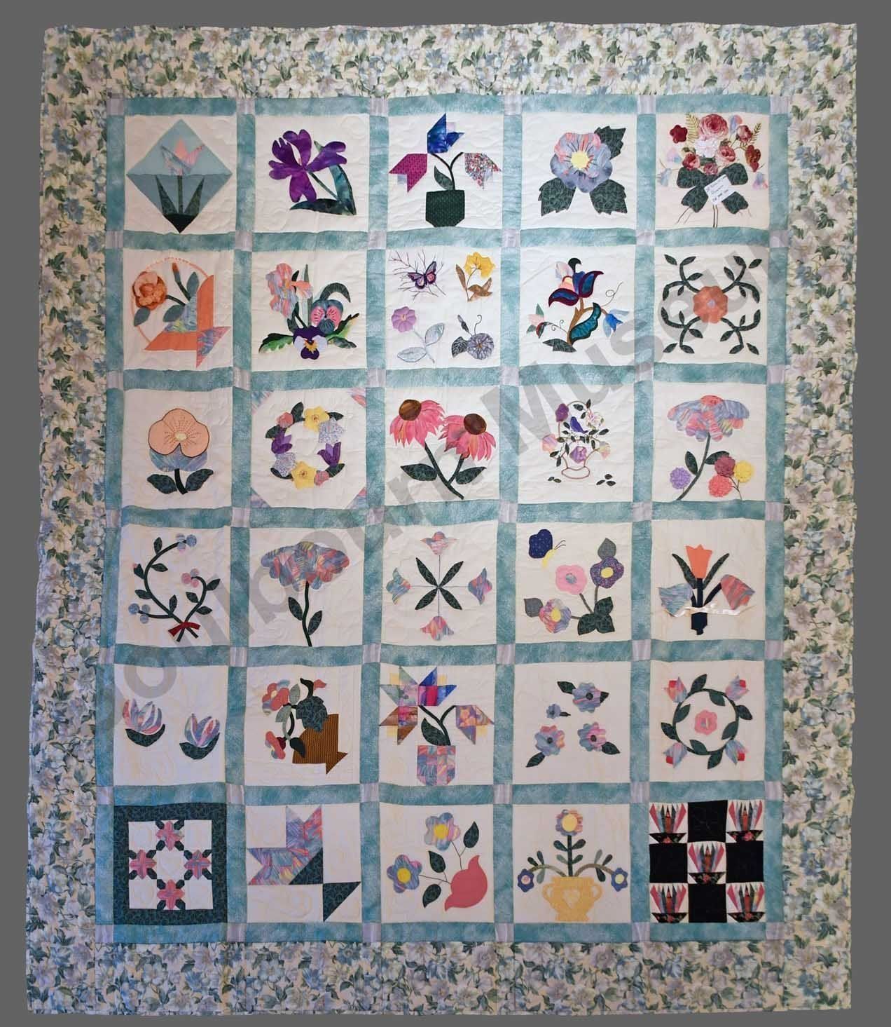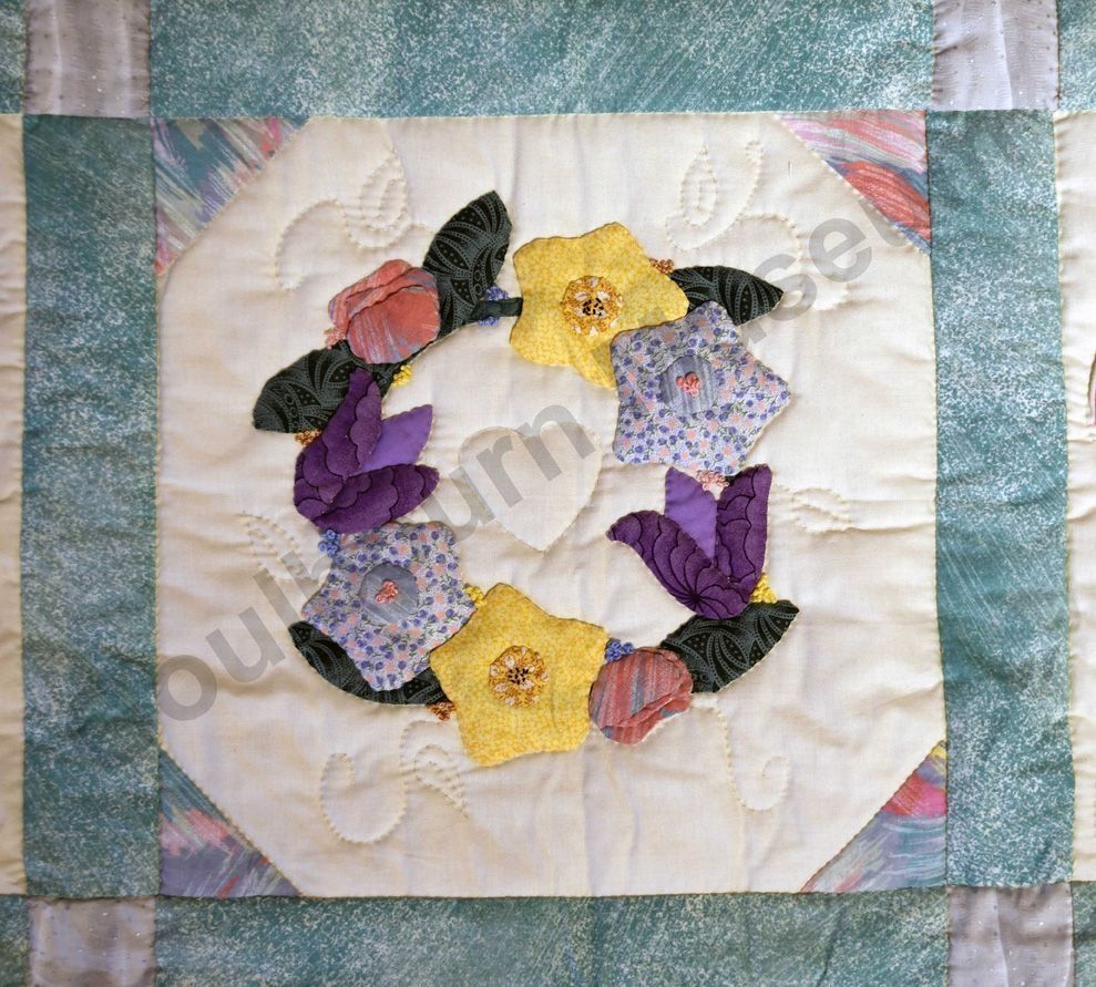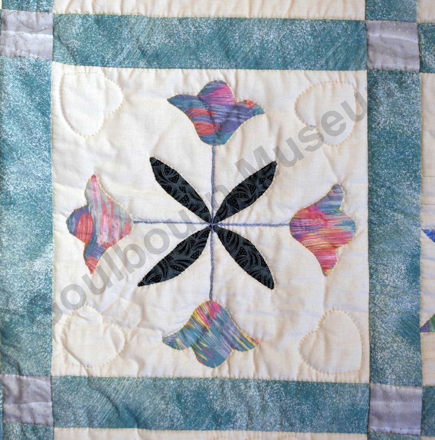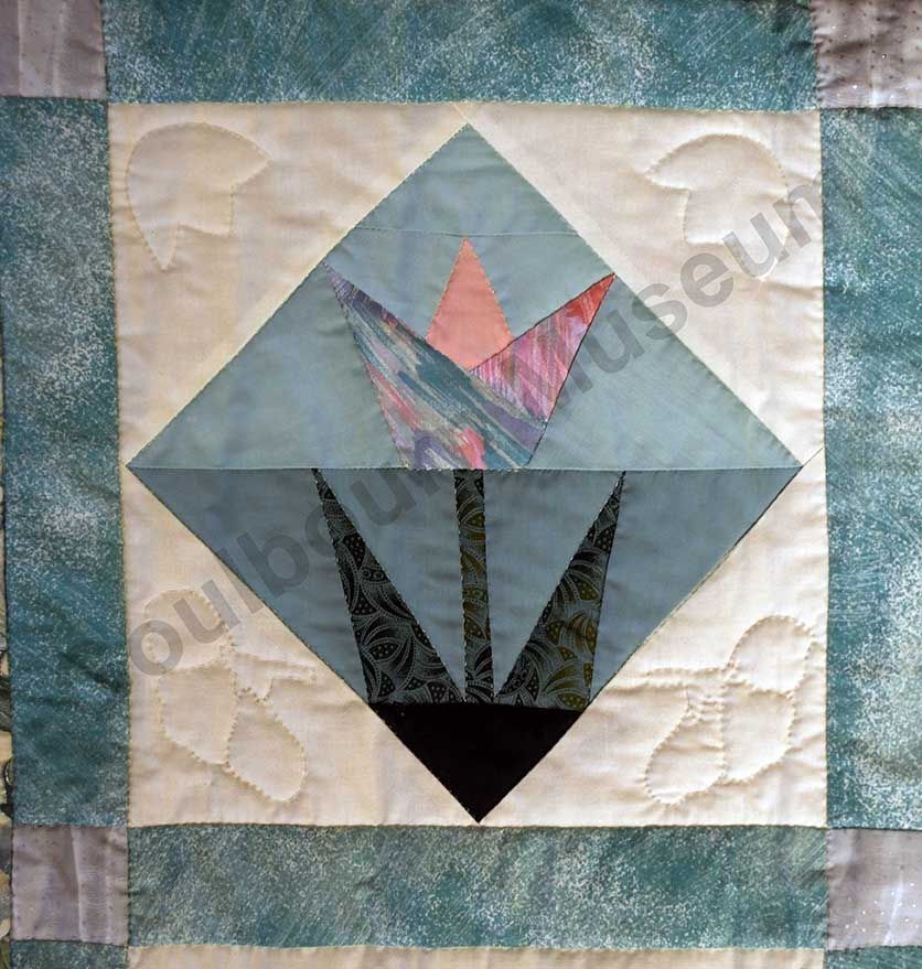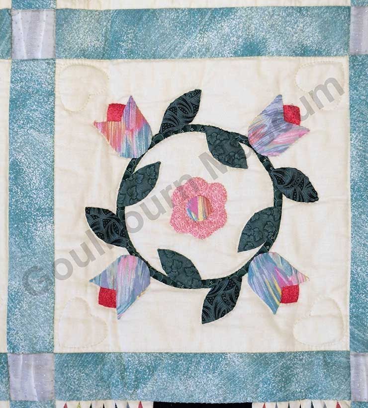 1st challenge quilt made by the guild in 1999/2000. Each block made by different members and hand quilled by the group.Collection