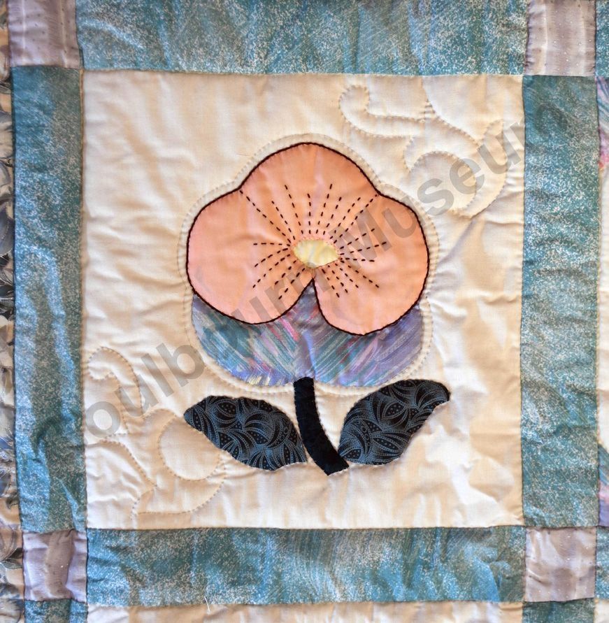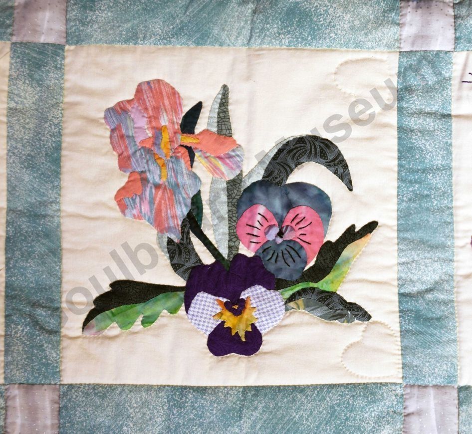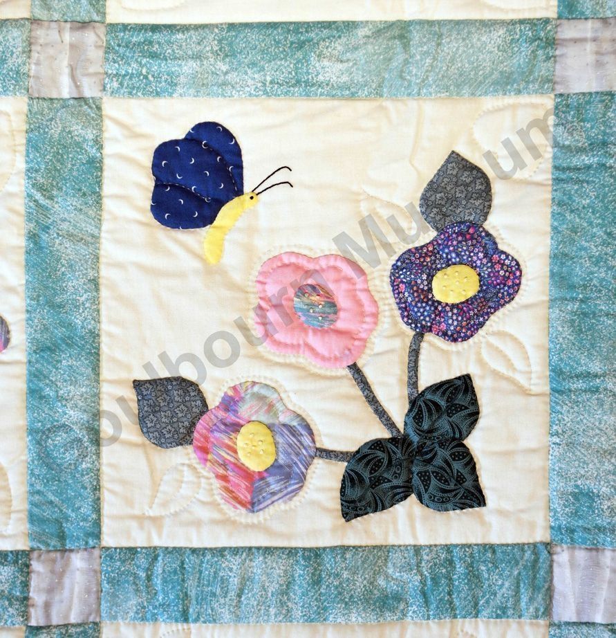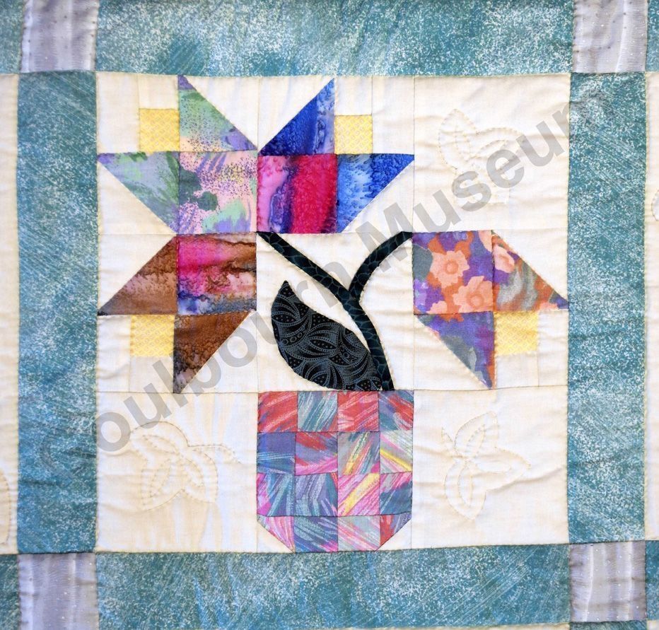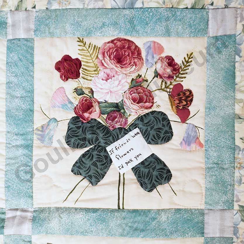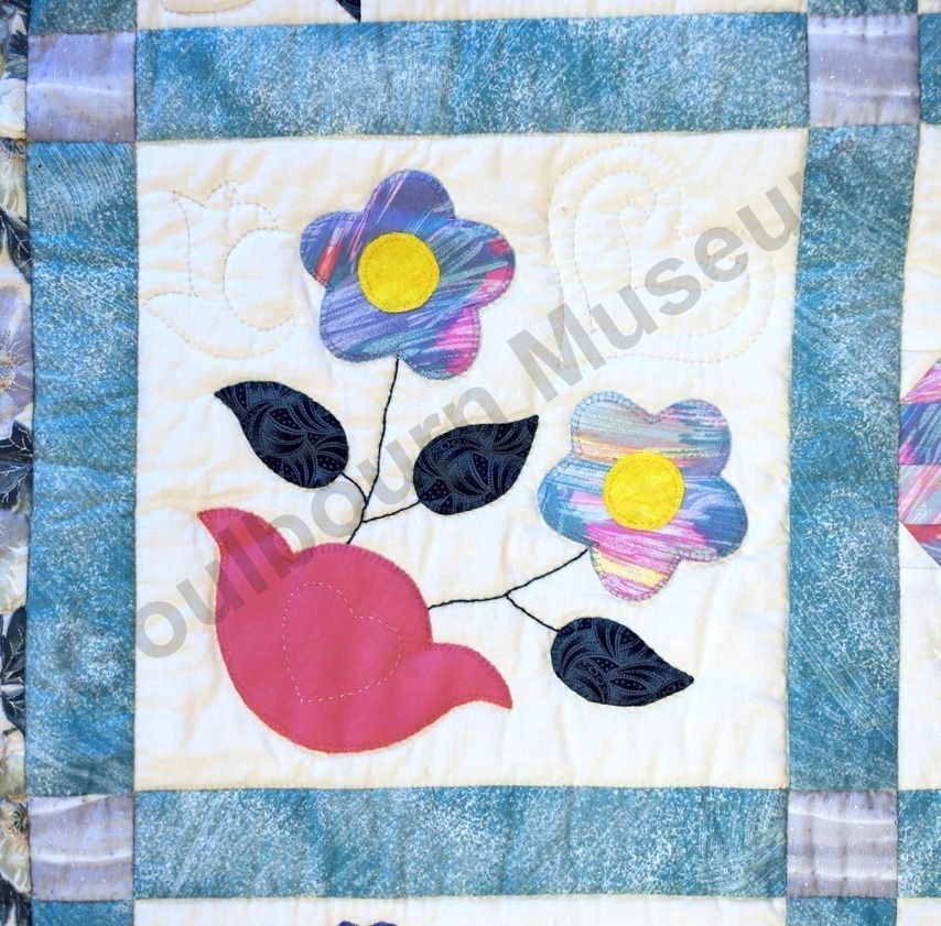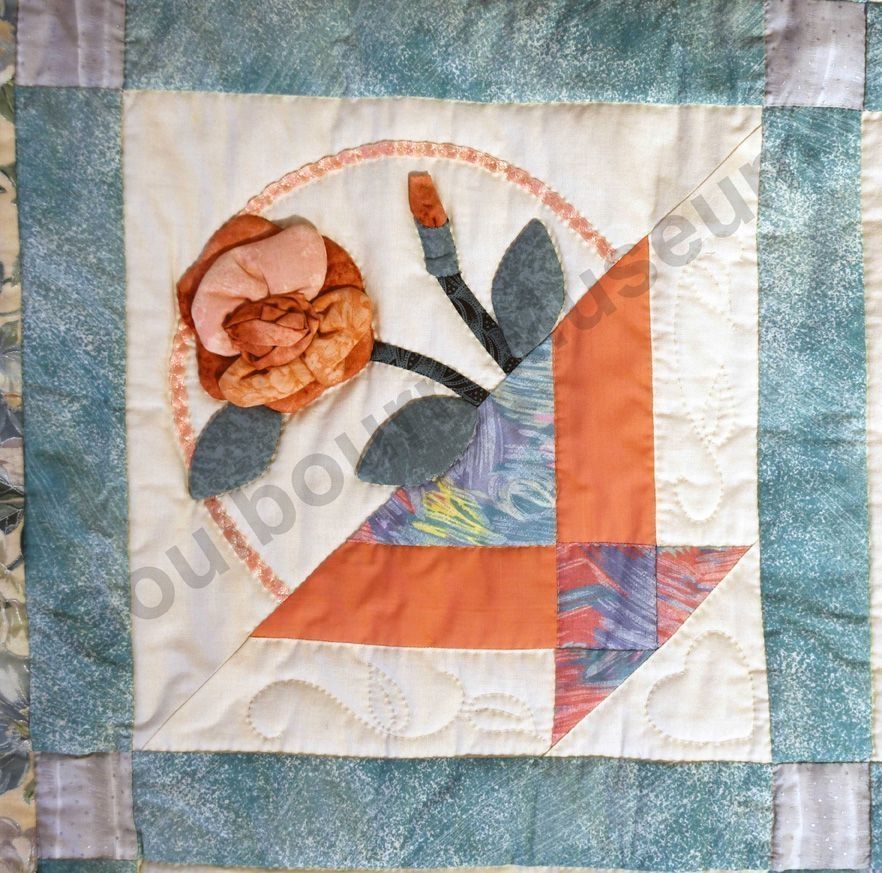1st challenge quilt made by the guild in 1999/2000. Each block made by different members and hand quilled by the group.Collection