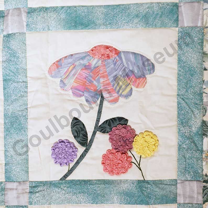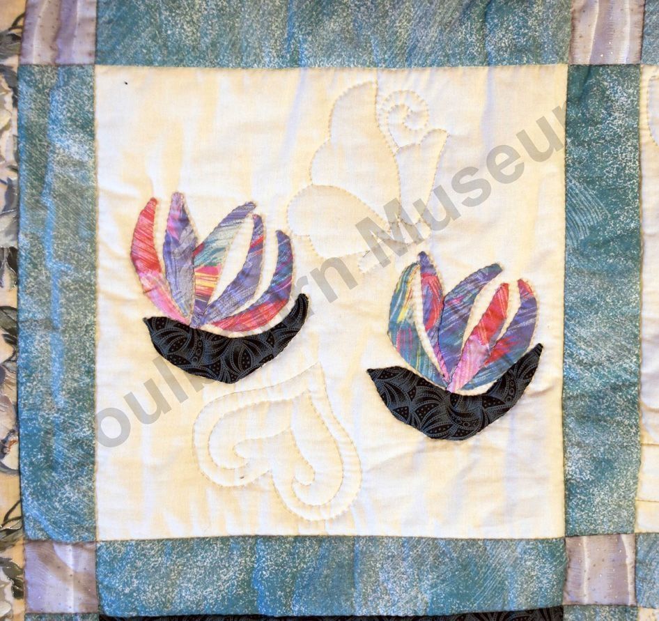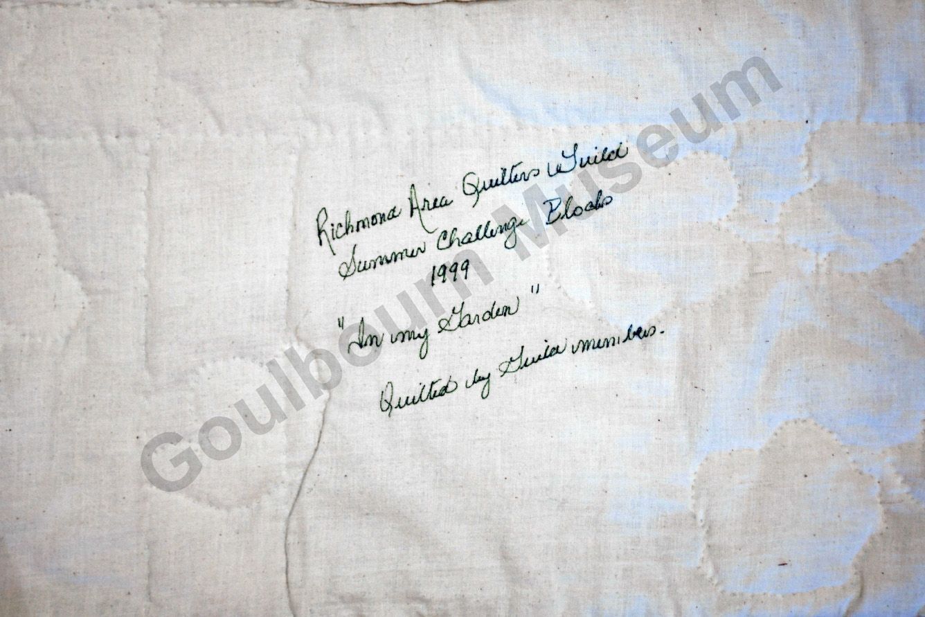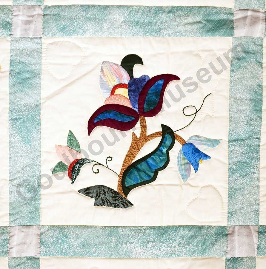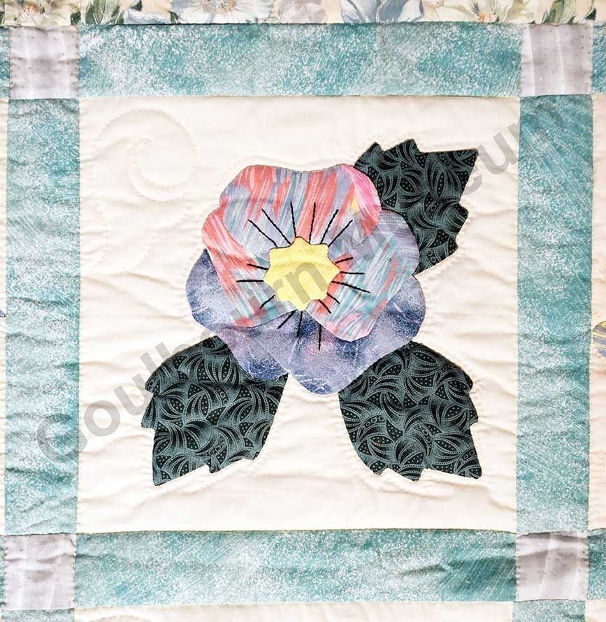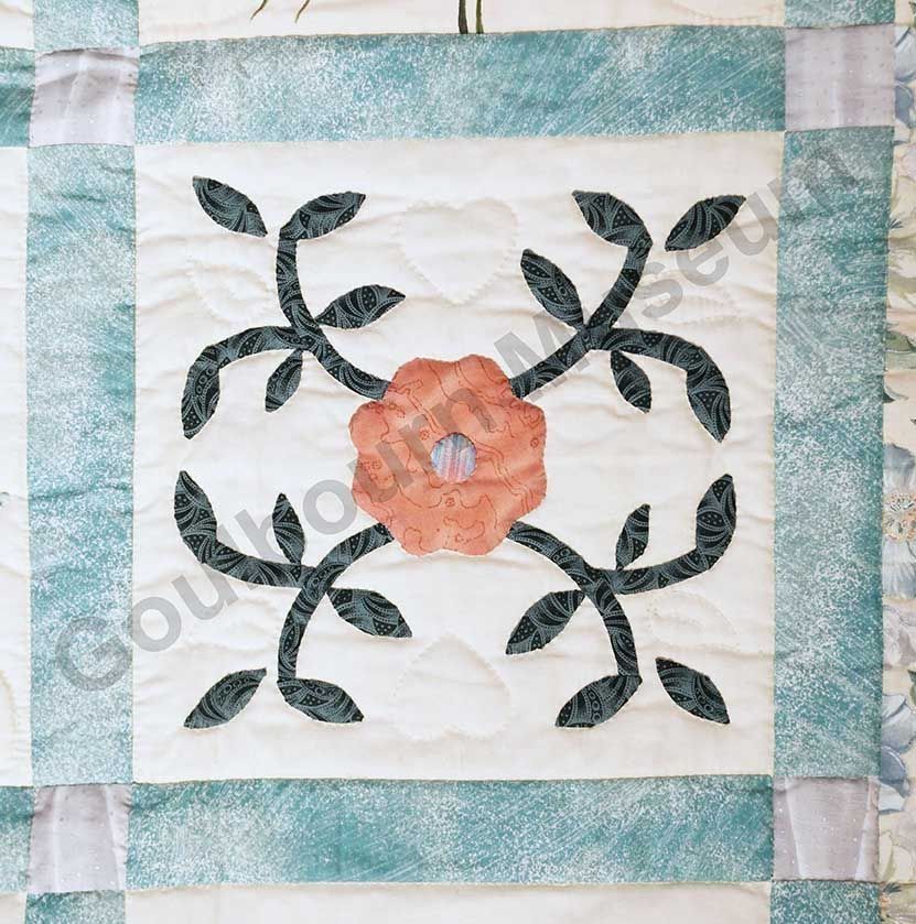 1st challenge quilt made by the guild in 1999/2000. Each block made by different members and hand quilled by the group.Collection