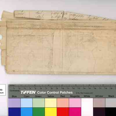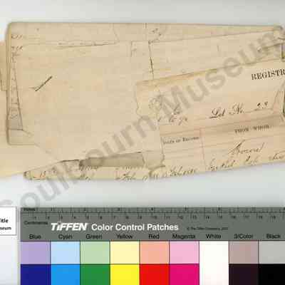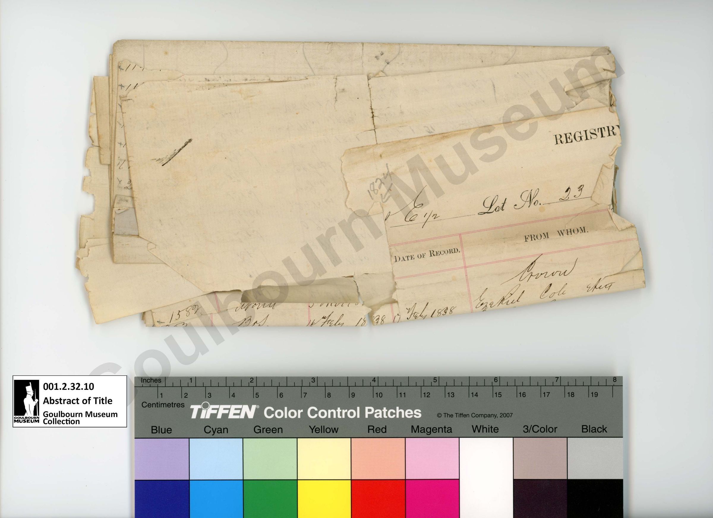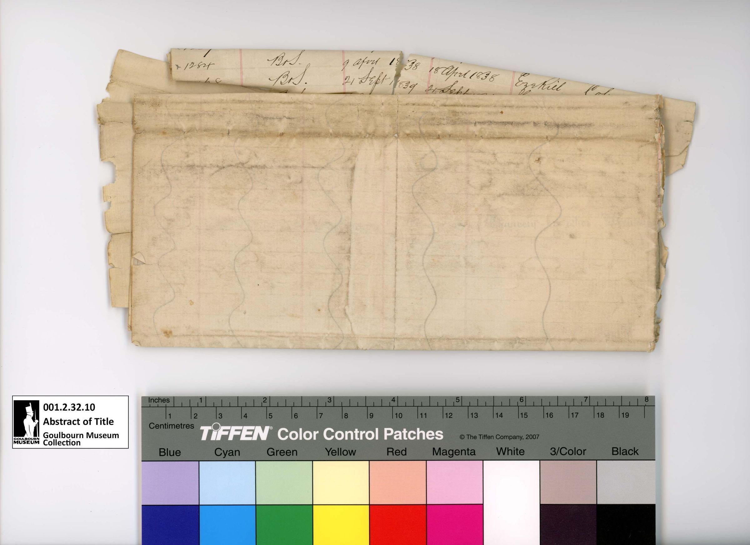 This object is an abstract of title documenting historic land ownership. The parcel of land was unable to be fully determined at this time as the document was not able to be opened fully; however, the designation Lot 23 is visible. Visible names include: Ezekiel Cole, Jackson Stitt, William Alexander, Daniel Fisher, Andrew Alexander, Kenneth M. and John Hodgins. The support is a cream colored paper. The medium is a black printed ink. A brown ink has been used to fill in the fields in a cursive handwritten script. An inscription reading "1824" is rendered in pencil. Red ink has been used for administrative purposes. The vertical lines of the table are rendered in a red ink, and are themselves comprised of two small parallel red lines. The horizontal lines of the table are severely faded to the point of invisibility in places. Five vertical lines are visible through the page at the bottom of the back; they assume a sinusoidal form aka wiggly shaped.Context