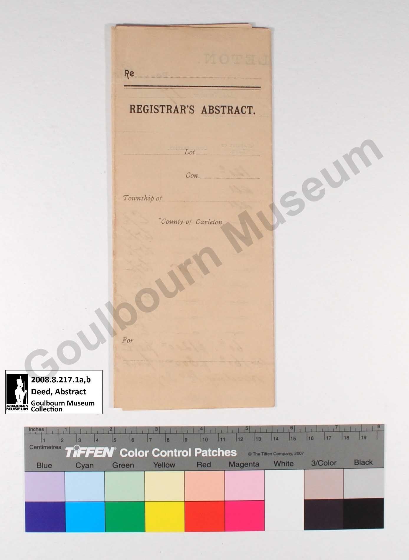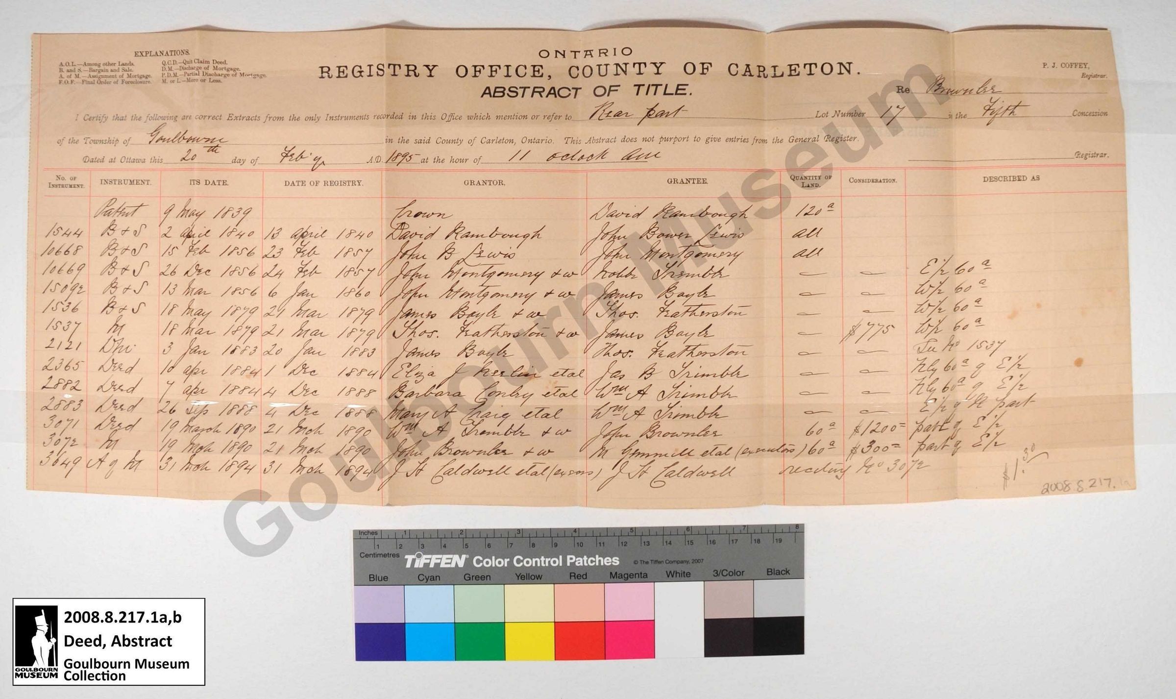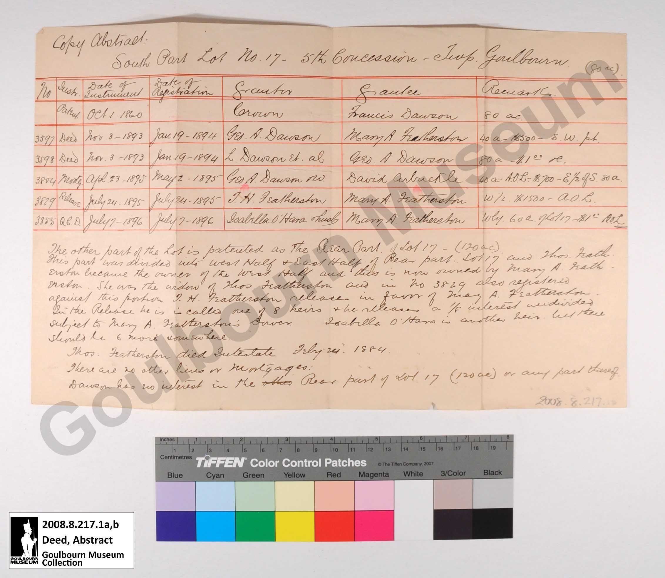 These documents are abstracts of title for the rear of lot 17 on concession 5 of Goulbourn Township. They track the ownership from 1839 to 1895. The final owner listed is one J.H. Caldwell on the first document up until 1896 and Mary Featherston until 1896 on the second.Collection