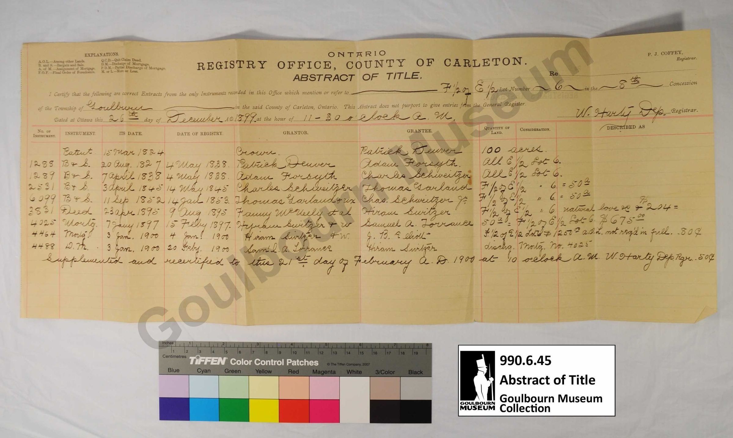 This object is an abstract of title regarding a plot of land designated "F1/2 of E1/2, Lot 6, Concession 8". It spans from 1824-1900. It is dated December 26, 1899. The support is a cream colored piece of paper. The medium is a printed black ink. The fields have been filled in with a black handwritten ink, rendered in cursive. The title at the top center of the front reads "ONTARIO, REGISTRY OFFICE, COUNTY OF CARLETON, ABSRTACT OF TITLE" in a larger font, in black ink, in all capital letters. The back of the page features the title page located on the proper left side. The name "Switzer" appears at the top of title page, rendered in a handwritten blue ink.Context