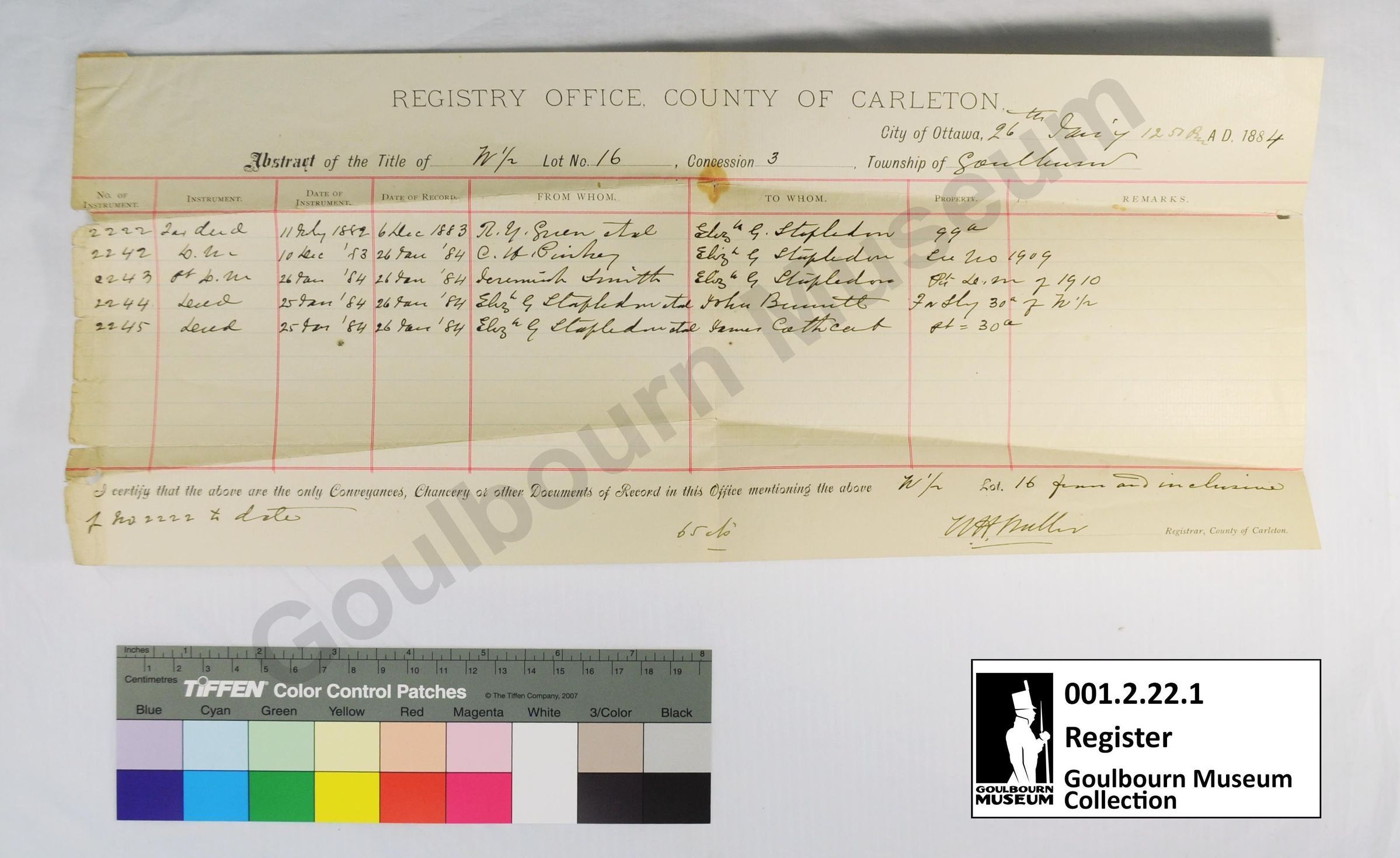 This object is an abstract of title issued by the County of Carleton Registry Office. It is dated to 1884. It covers land ownership from 1882-1884. The support is a rectangular piece of cream colored paper. The medium is a black ink. Red and blue ink have been used to create a spreadsheet located centrally on the page. The fields are filled in with a a black handwritten ink. The title "REGISTRY OFFICE, COUNTY OF CARLETON" appears at the top of the page in all capital letters. The plot of land is designated W 1/2 Lot 16 Concession 3.Context