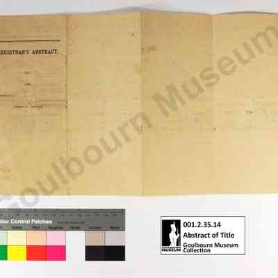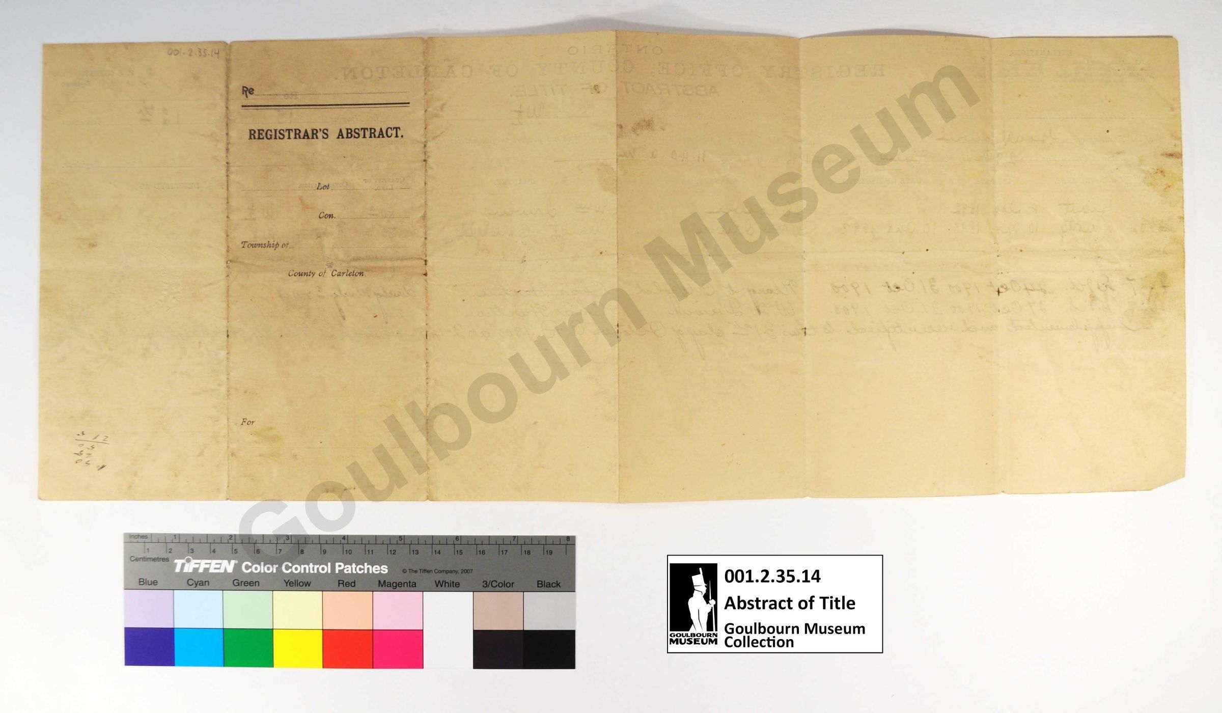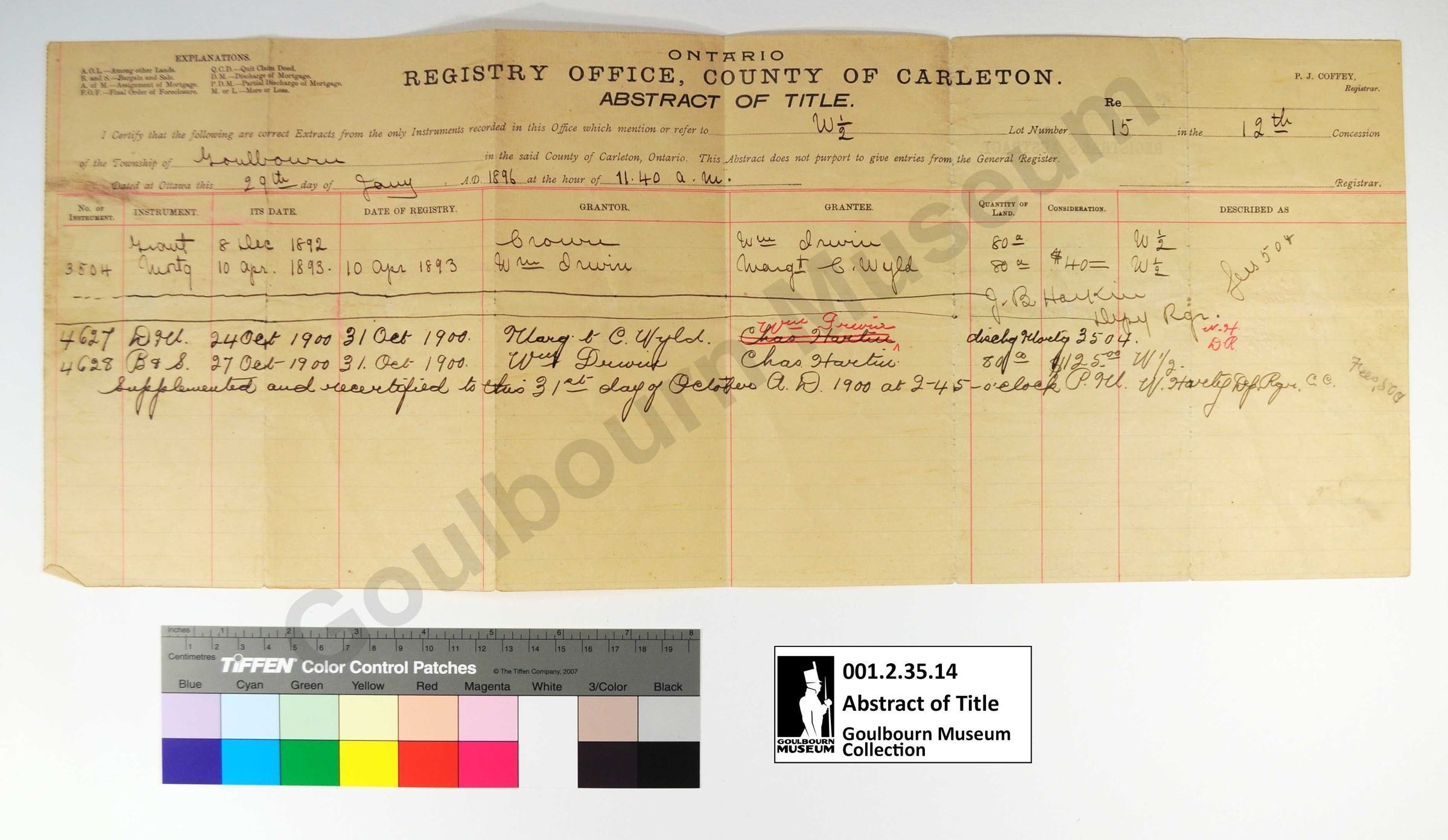 This object is an abstract of title listing land ownership for a parcel designated W1/2 Lot 15 Concession 12. The dates range from 1892 to 1900. Although the document is dated 1896, an inscription reads "Supplemented and recertified to this 31st day of October AD 1900". Legible surnames which appear include: Brown, Wyld, Hartin and Irwin. The support is a rectangular piece of cream colored paper. The medium is a black printed ink. Red and blue ink have been used to create a table on the front. Black, brown, and red inks have been used to fill in the fields by hand, rendered in cursive.