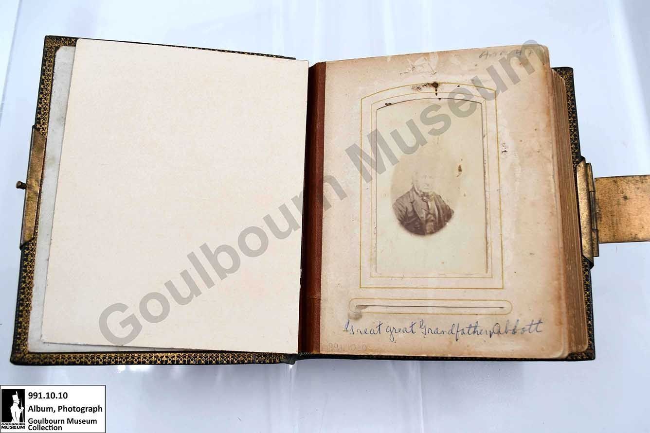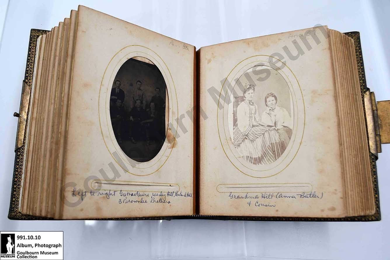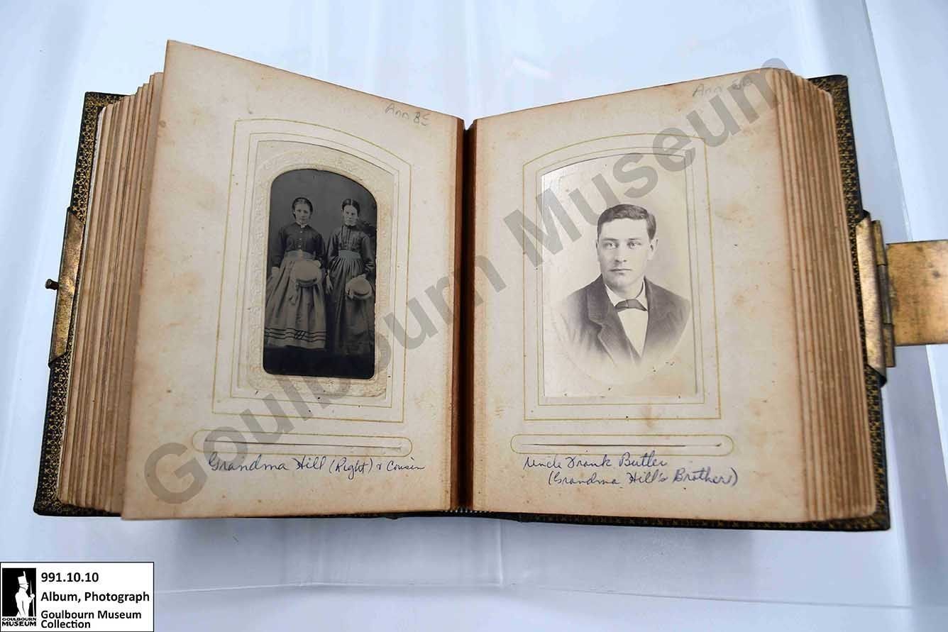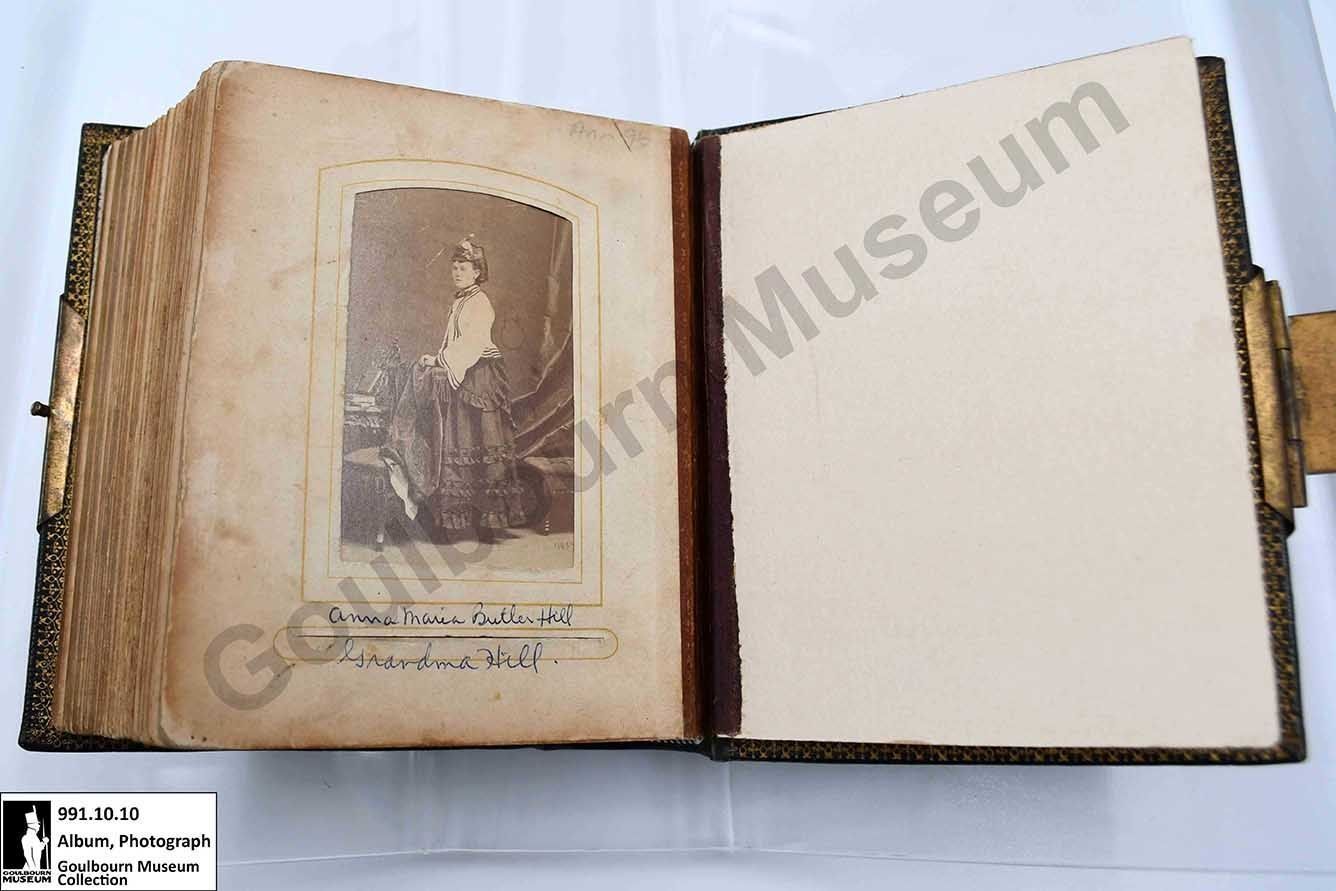 Presumed to have been created by Anna Maria Hill and inscribed by one of her grandchildren. At the beginning of the album is a photo of Francis Abbott. He and his wife Jane Dagg were born in Ireland and first settled in Nepean Township around 1822. Their daughter Sarah Ann married William Henry Butler and the family lived in Hazeldean. By the time of the 1871 Census Sarah and William's family made Richmond, Ontario their home. Sarah and William's daughter Anna Maria married James Rowland Hill in Richmond on June 10th 1874. This album, which was inscribed by one of their grandchildren, identifies the cousins, siblings, spouses, and acquaintances of the Butlers and Hills. The photos preserved inside the pages are albumen prints and tintypes that date from approximately the 1860s to 1880s. Anna Maria died June 20, 1882 at the age of 28 and is laid to rest in Richmond.Collection