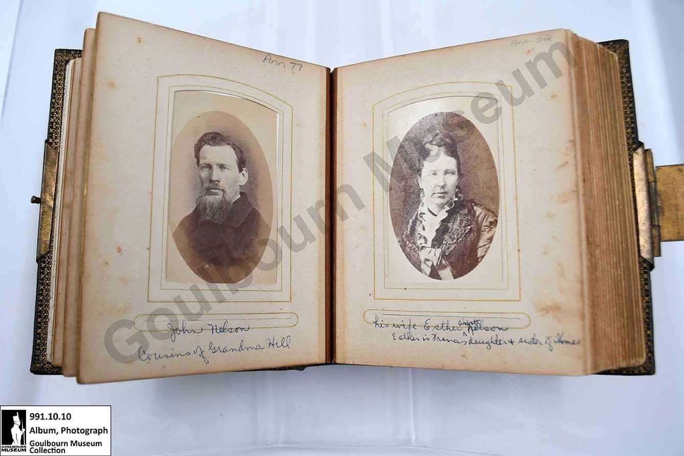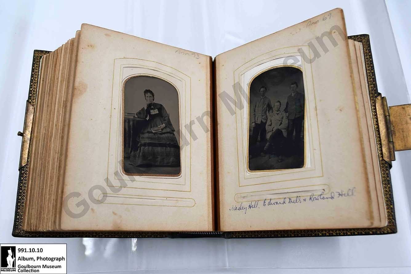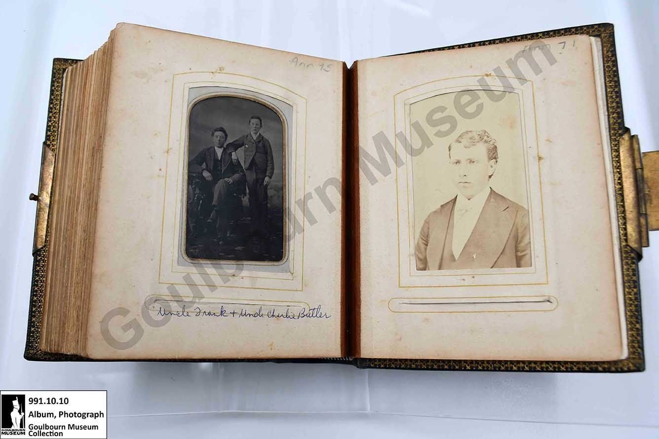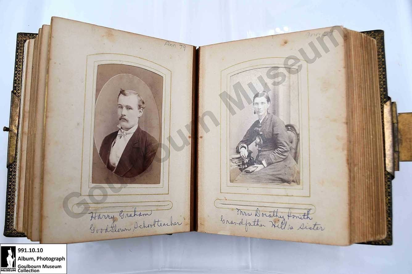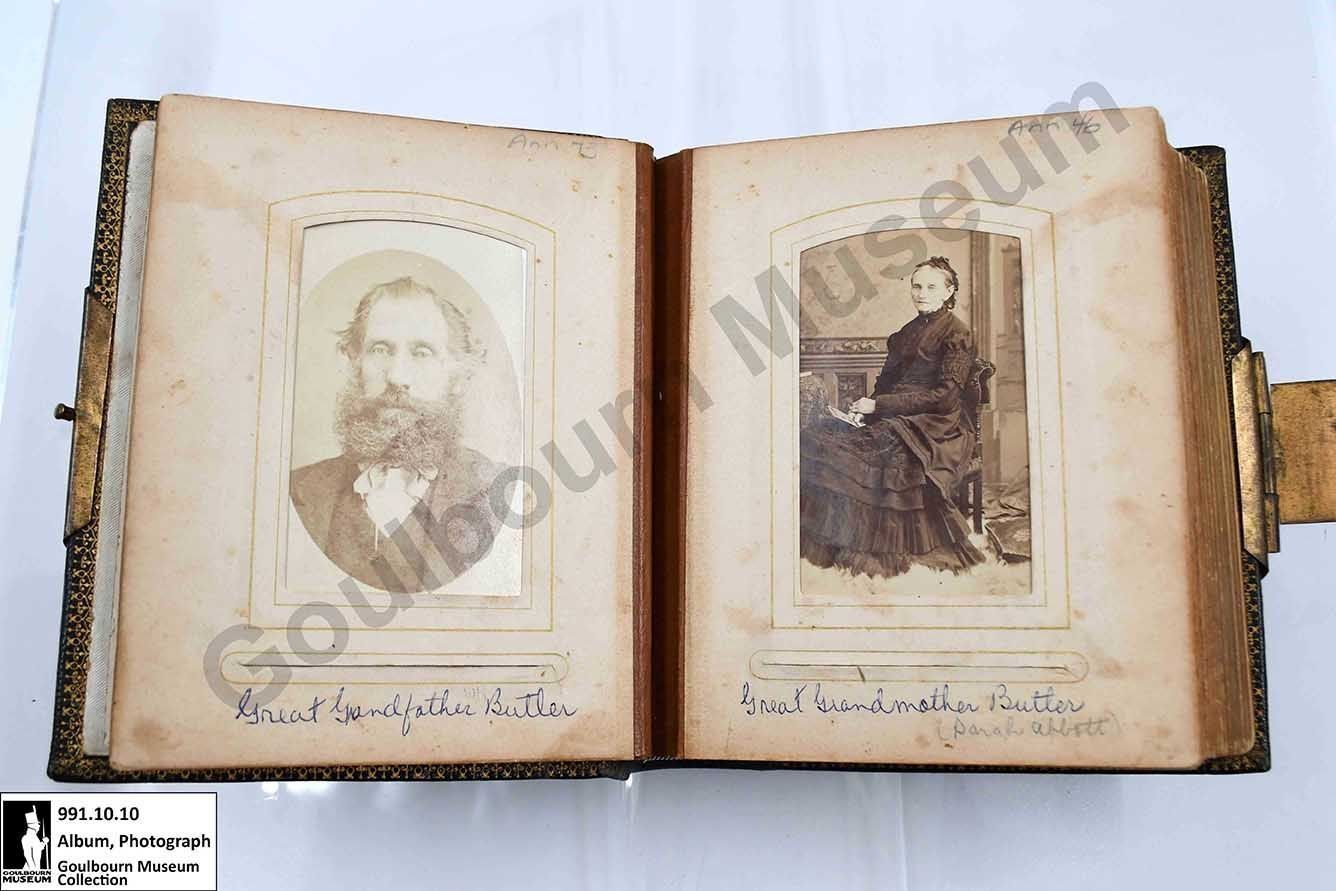 Presumed to have been created by Anna Maria Hill and inscribed by one of her grandchildren. At the beginning of the album is a photo of Francis Abbott. He and his wife Jane Dagg were born in Ireland and first settled in Nepean Township around 1822. Their daughter Sarah Ann married William Henry Butler and the family lived in Hazeldean. By the time of the 1871 Census Sarah and William's family made Richmond, Ontario their home. Sarah and William's daughter Anna Maria married James Rowland Hill in Richmond on June 10th 1874. This album, which was inscribed by one of their grandchildren, identifies the cousins, siblings, spouses, and acquaintances of the Butlers and Hills. The photos preserved inside the pages are albumen prints and tintypes that date from approximately the 1860s to 1880s. Anna Maria died June 20, 1882 at the age of 28 and is laid to rest in Richmond.Collection