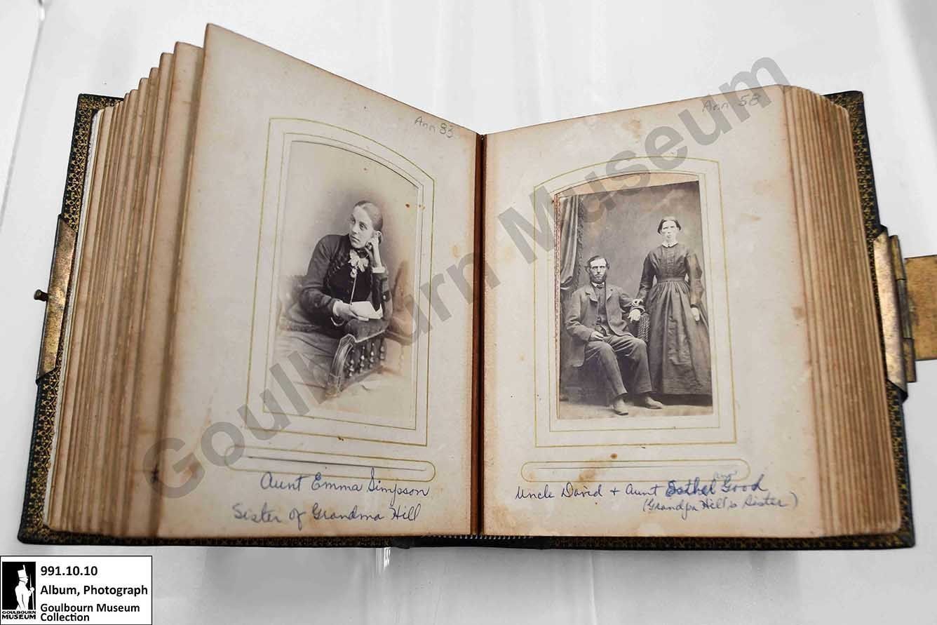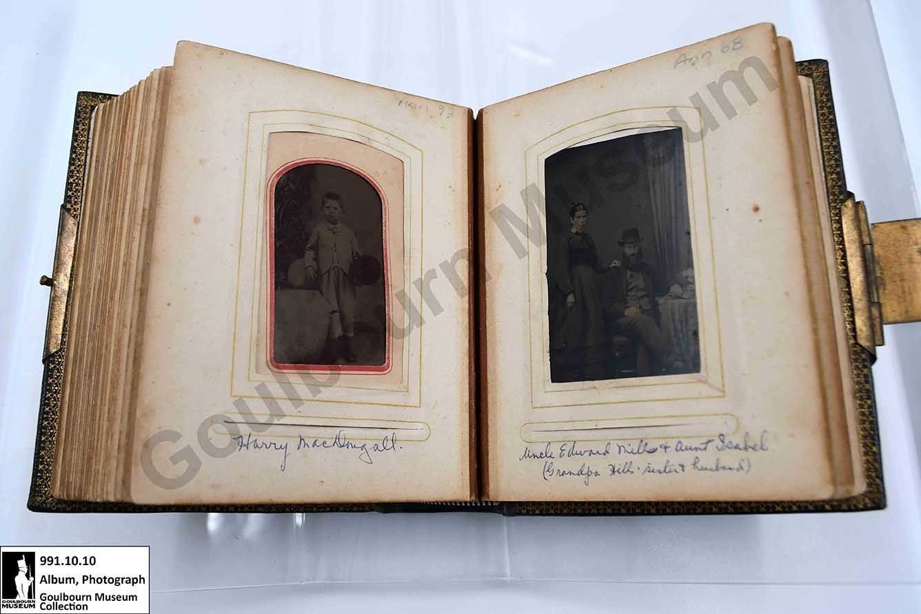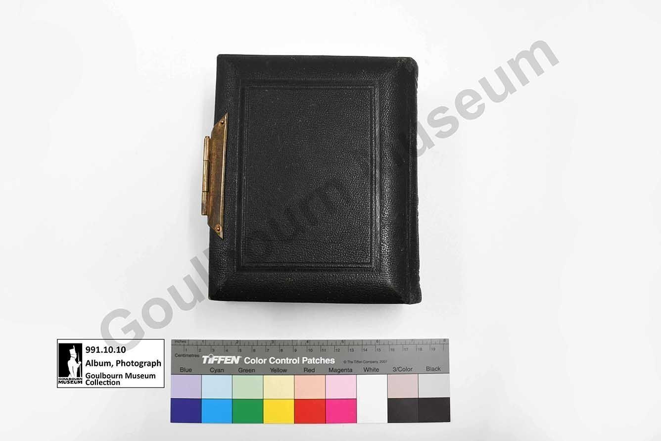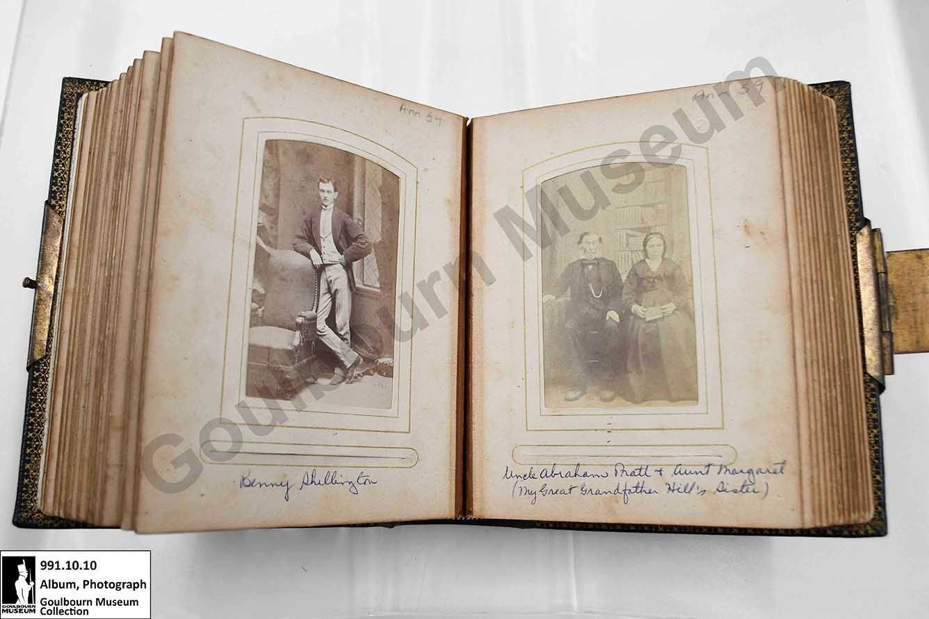 Presumed to have been created by Anna Maria Hill and inscribed by one of her grandchildren. At the beginning of the album is a photo of Francis Abbott. He and his wife Jane Dagg were born in Ireland and first settled in Nepean Township around 1822. Their daughter Sarah Ann married William Henry Butler and the family lived in Hazeldean. By the time of the 1871 Census Sarah and William's family made Richmond, Ontario their home. Sarah and William's daughter Anna Maria married James Rowland Hill in Richmond on June 10th 1874. This album, which was inscribed by one of their grandchildren, identifies the cousins, siblings, spouses, and acquaintances of the Butlers and Hills. The photos preserved inside the pages are albumen prints and tintypes that date from approximately the 1860s to 1880s. Anna Maria died June 20, 1882 at the age of 28 and is laid to rest in Richmond.Collection